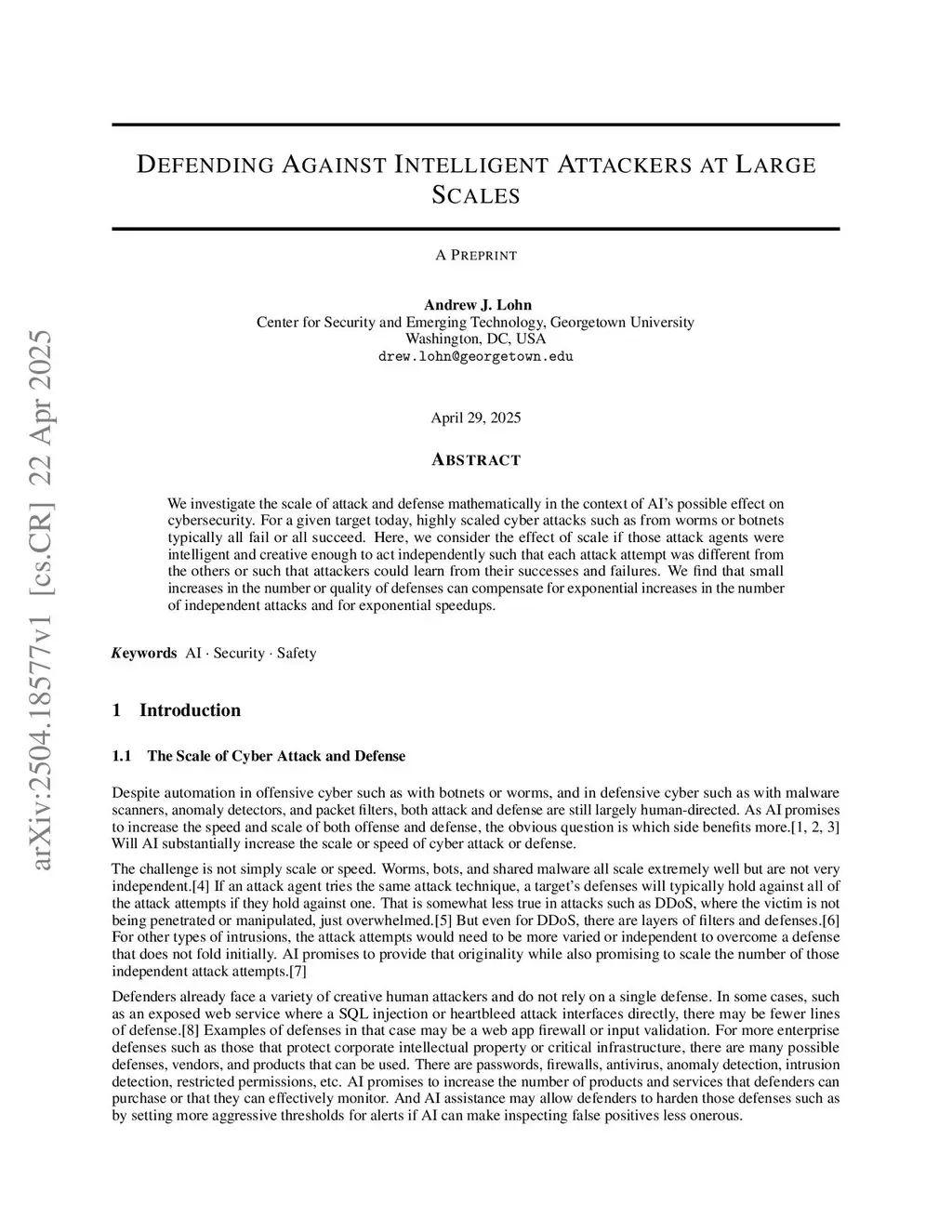 We investigate the scale of attack and defense mathematically in the context of AI's possible effect on cybersecurity. For a given target today, highly scaled cyber attacks such as from worms or botnets typically all fail or all succeed. Here, we consider the effect of scale if those attack agents were intelligent and creative enough to act independently such that each attack attempt was different from the others or such that attackers could learn from their successes and failures. We find that small increases in the number or quality of defenses can compensate for exponential increases in the number of independent attacks and for exponential speedups.