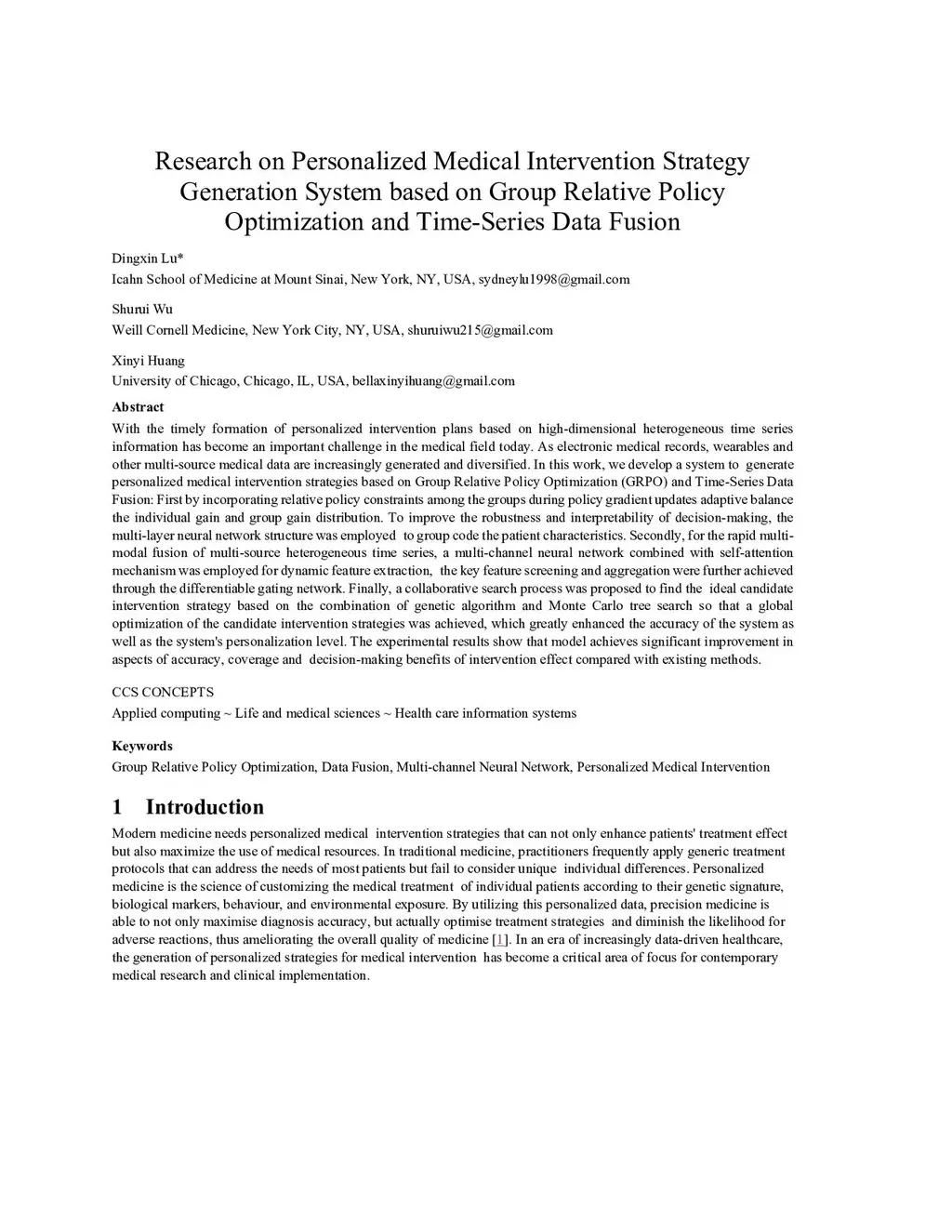 With the timely formation of personalized intervention plans based on high-dimensional heterogeneous time series information becoming an important challenge in the medical field today, electronic medical records, wearables, and other multi-source medical data are increasingly generated and diversified. In this work, we develop a system to generate personalized medical intervention strategies based on Group Relative Policy Optimization (GRPO) and Time-Series Data Fusion. First, by incorporating relative policy constraints among the groups during policy gradient updates, we adaptively balance individual and group gains. To improve the robustness and interpretability of decision-making, a multi-layer neural network structure is employed to group-code patient characteristics. Second, for the rapid multi-modal fusion of multi-source heterogeneous time series, a multi-channel neural network combined with a self-attention mechanism is used for dynamic feature extraction. Key feature screening and aggregation are achieved through a differentiable gating network. Finally, a collaborative search process combining a genetic algorithm and Monte Carlo tree search is proposed to find the ideal intervention strategy, achieving global optimization. Experimental results show significant improvements in accuracy, coverage, and decision-making benefits compared with existing methods.