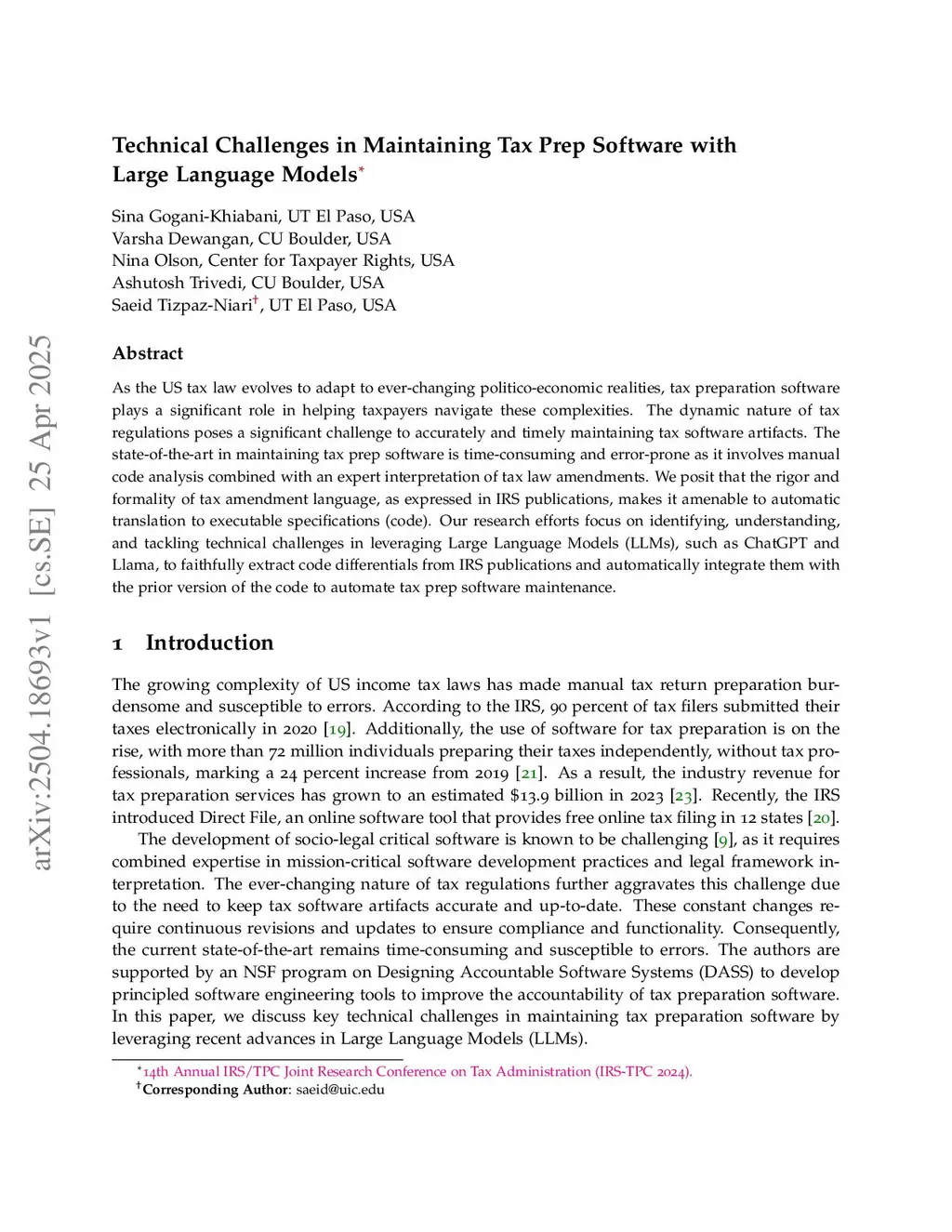 As the US tax law evolves to adapt to ever-changing politico-economic realities, tax preparation software plays a significant role in helping taxpayers navigate these complexities. The dynamic nature of tax regulations poses a significant challenge to accurately and timely maintaining tax software artifacts. The state-of-the-art in maintaining tax prep software is time-consuming and error-prone as it involves manual code analysis combined with an expert interpretation of tax law amendments. We posit that the rigor and formality of tax amendment language, as expressed in IRS publications, makes it amenable to automatic translation to executable specifications (code). Our research efforts focus on identifying, understanding, and tackling technical challenges in leveraging Large Language Models (LLMs), such as ChatGPT and Llama, to faithfully extract code differentials from IRS publications and automatically integrate them with the prior version of the code to automate tax prep software maintenance.