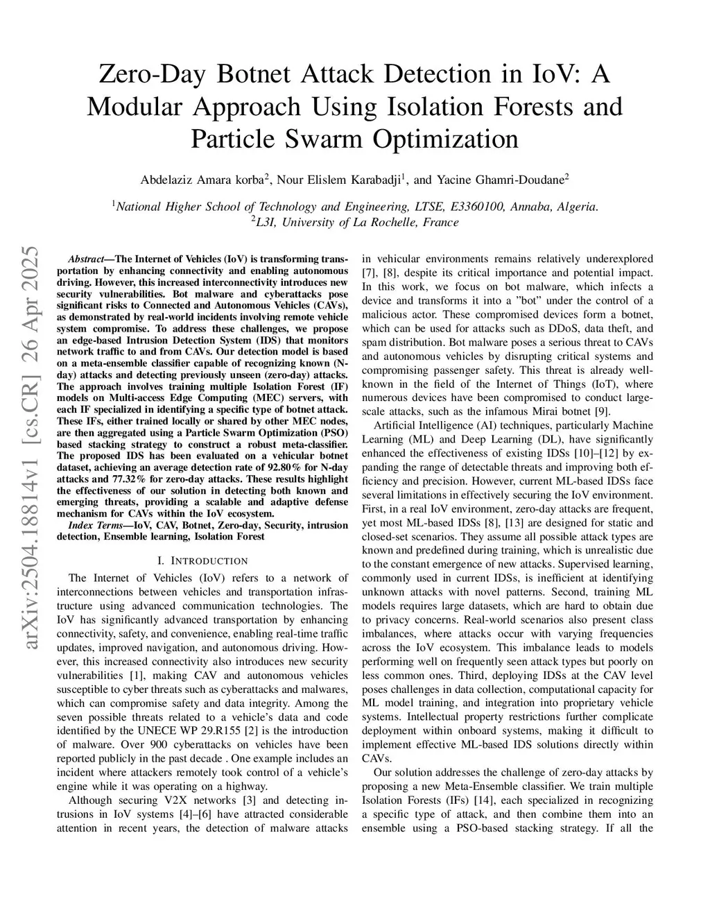 Zero-Day Botnet Attack Detection in IoV: A Modular Approach Using Isolation Forests and Particle Swarm Optimization