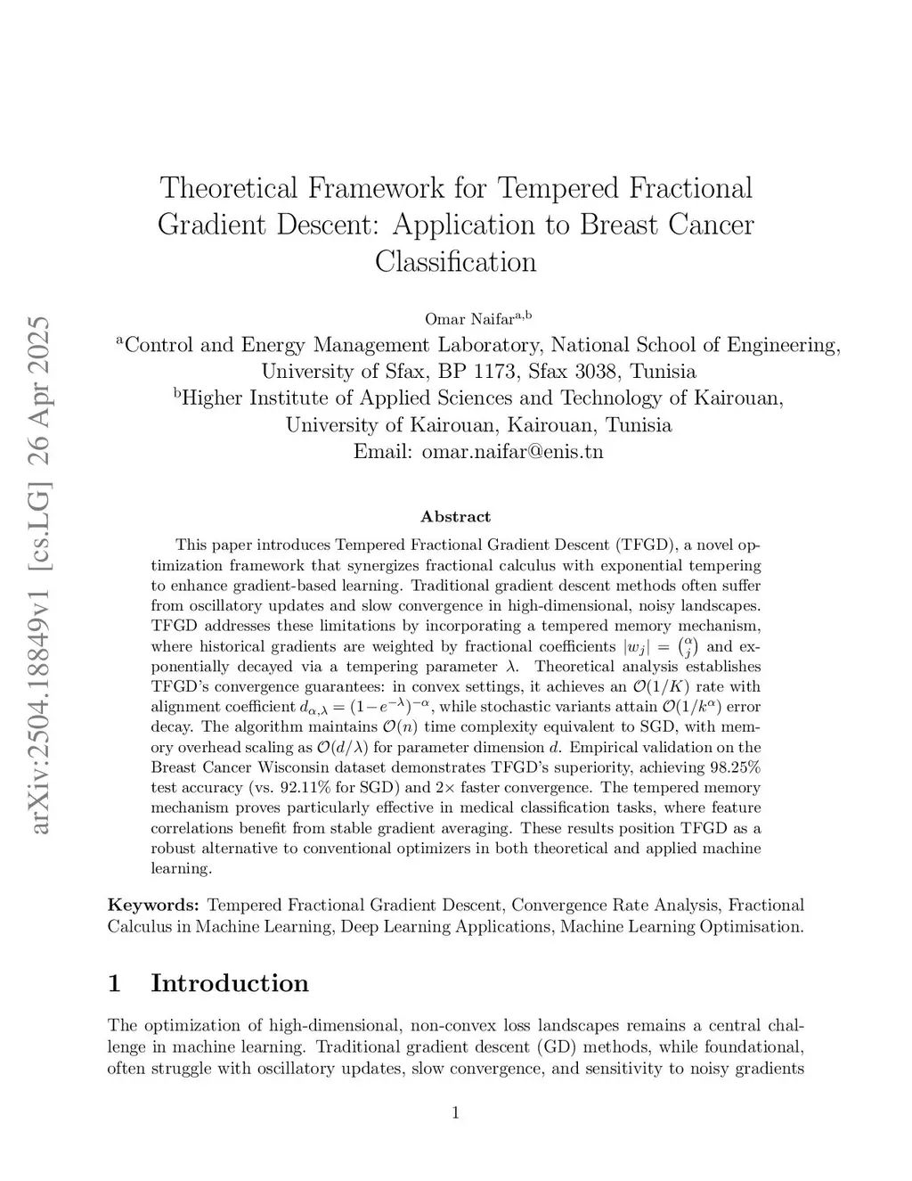 Theoretical Framework for Tempered Fractional Gradient Descent: Application to Breast Cancer Classification