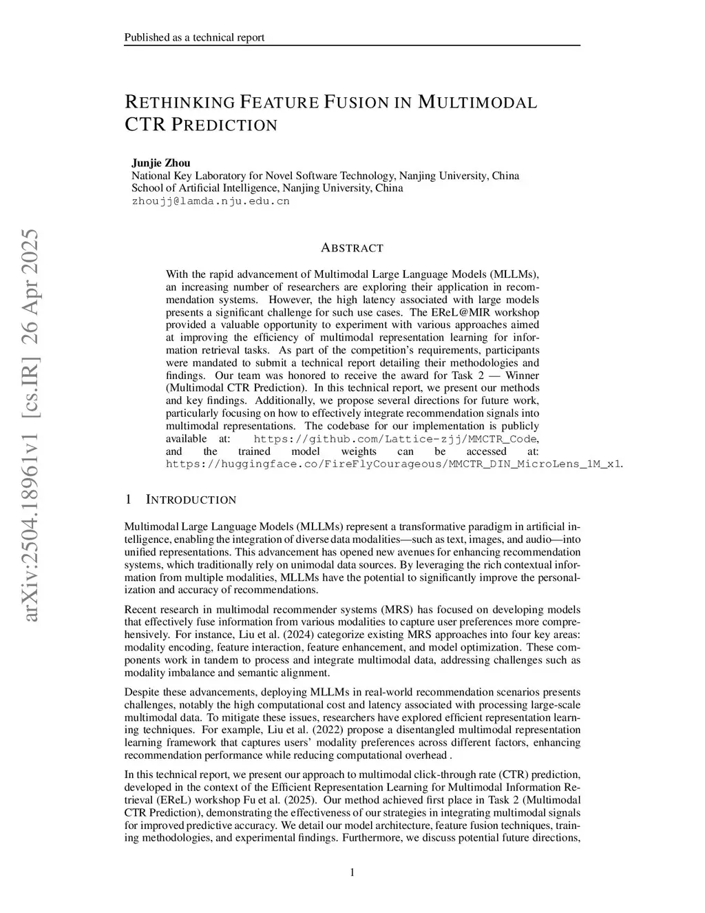 With the rapid advancement of Multimodal Large Language Models (MLLMs), an increasing number of researchers are exploring their application in recommendation systems. However, the high latency associated with large models presents a significant challenge for such use cases. The EReL@MIR workshop provided a valuable opportunity to experiment with various approaches aimed at improving the efficiency of multimodal representation learning for information retrieval tasks. As part of the competition's requirements, participants were mandated to submit a technical report detailing their methodologies and findings. Our team was honored to receive the award for Task 2 - Winner (Multimodal CTR Prediction). In this technical report, we present our methods and key findings. Additionally, we propose several directions for future work, particularly focusing on how to effectively integrate recommendation signals into multimodal representations. The codebase for our implementation is publicly available at:this https URL, and the trained model weights can be accessed at:this https URL.