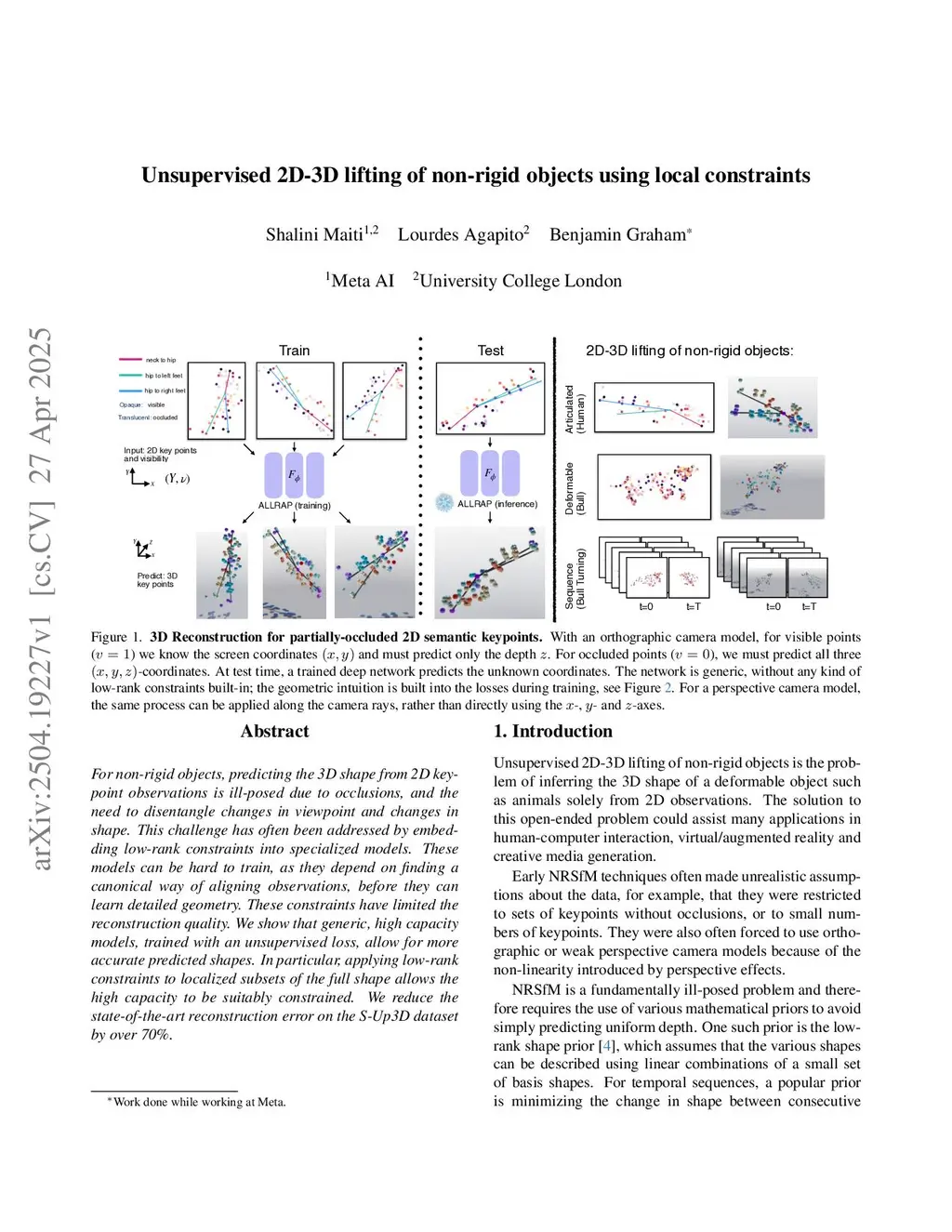 Unsupervised 2D-3D lifting of non-rigid objects using local constraints
