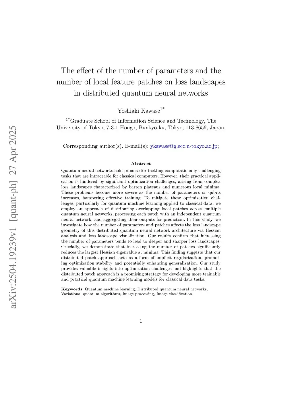 The effect of the number of parameters and the number of local feature patches on loss landscapes in distributed quantum neural networks