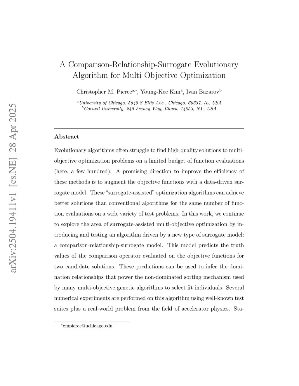 Evolutionary algorithms often struggle to find well converged (e.g small inverted generational distance on test problems) solutions to multi-objective optimization problems on a limited budget of function evaluations (here, a few hundred). The family of surrogate-assisted evolutionary algorithms (SAEAs) offers a potential solution to this shortcoming through the use of data driven models which augment evaluations of the objective functions. A surrogate model which has shown promise in single-objective optimization is to predict the "comparison relationship" between pairs of solutions (i.e. who's objective function is smaller). In this paper, we investigate the performance of this model on multi-objective optimization problems. First, we propose a new algorithm "CRSEA" which uses the comparison-relationship model. Numerical experiments are then performed with the DTLZ and WFG test suites plus a real-world problem from the field of accelerator physics. We find that CRSEA finds better converged solutions than the tested SAEAs on many of the medium-scale, biobjective problems chosen from the WFG suite suggesting the comparison-relationship surrogate as a promising tool for improving the efficiency of multi-objective optimization algorithms.