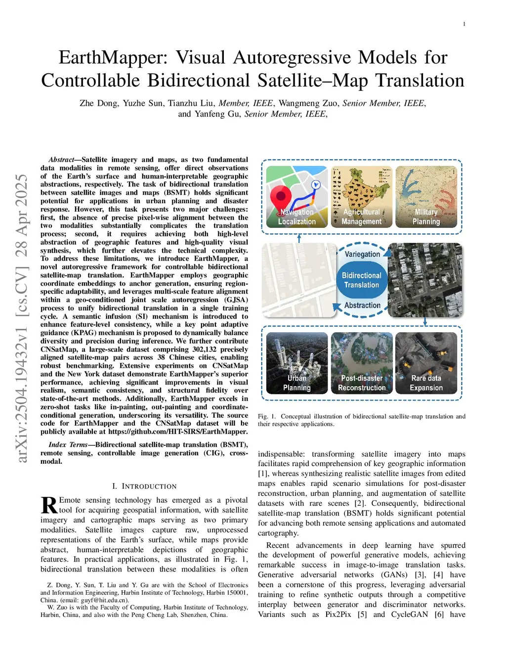 Satellite imagery and maps, as two fundamental data modalities in remote sensing, offer direct observations of the Earth's surface and human-interpretable geographic abstractions, respectively. The task of bidirectional translation between satellite images and maps (BSMT) holds significant potential for applications in urban planning and disaster response. However, this task presents two major challenges: first, the absence of precise pixel-wise alignment between the two modalities substantially complicates the translation process; second, it requires achieving both high-level abstraction of geographic features and high-quality visual synthesis, which further elevates the technical complexity. To address these limitations, we introduce EarthMapper, a novel autoregressive framework for controllable bidirectional satellite-map translation. EarthMapper employs geographic coordinate embeddings to anchor generation, ensuring region-specific adaptability, and leverages multi-scale feature alignment within a geo-conditioned joint scale autoregression (GJSA) process to unify bidirectional translation in a single training cycle. A semantic infusion (SI) mechanism is introduced to enhance feature-level consistency, while a key point adaptive guidance (KPAG) mechanism is proposed to dynamically balance diversity and precision during inference. We further contribute CNSatMap, a large-scale dataset comprising 302,132 precisely aligned satellite-map pairs across 38 Chinese cities, enabling robust benchmarking. Extensive experiments on CNSatMap and the New York dataset demonstrate EarthMapper's superior performance, achieving significant improvements in visual realism, semantic consistency, and structural fidelity over state-of-the-art methods. Additionally, EarthMapper excels in zero-shot tasks like in-painting, out-painting and coordinate-conditional generation, underscoring its versatility.