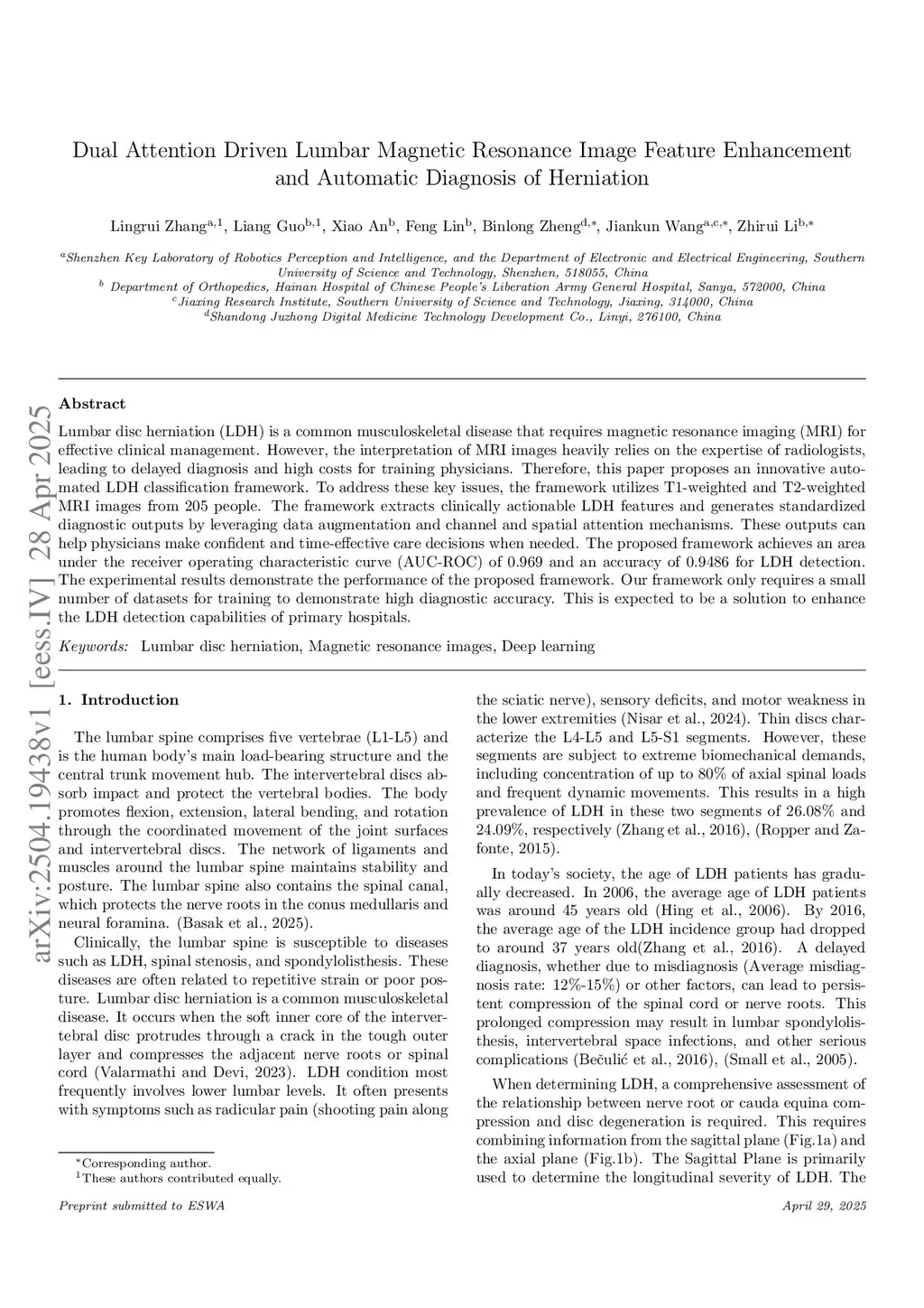 Lumbar disc herniation (LDH) is a common musculoskeletal disease that requires magnetic resonance imaging (MRI) for effective clinical management. However, the interpretation of MRI images heavily relies on the expertise of radiologists, leading to delayed diagnosis and high costs for training physicians. Therefore, this paper proposes an innovative automated LDH classification framework. To address these key issues, the framework utilizes T1-weighted and T2-weighted MRI images from 205 people. The framework extracts clinically actionable LDH features and generates standardized diagnostic outputs by leveraging data augmentation and channel and spatial attention mechanisms. These outputs can help physicians make confident and time-effective care decisions when needed. The proposed framework achieves an area under the receiver operating characteristic curve (AUC-ROC) of 0.969 and an accuracy of 0.9486 for LDH detection. The experimental results demonstrate the performance of the proposed framework. Our framework only requires a small number of datasets for training to demonstrate high diagnostic accuracy. This is expected to be a solution to enhance the LDH detection capabilities of primary hospitals.