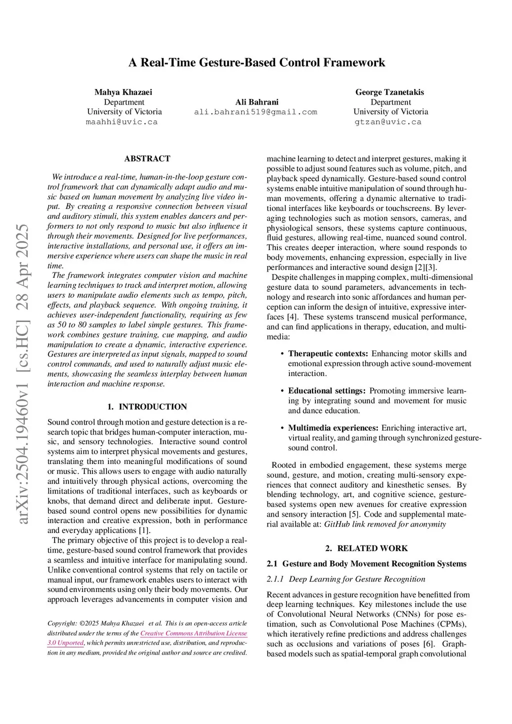 We introduce a real-time, human-in-the-loop gesture control framework that can dynamically adapt audio and music based on human movement by analyzing live video input. By creating a responsive connection between visual and auditory stimuli, this system enables dancers and performers to not only respond to music but also influence it through their movements. Designed for live performances, interactive installations, and personal use, it offers an immersive experience where users can shape the music in real time.The framework integrates computer vision and machine learning techniques to track and interpret motion, allowing users to manipulate audio elements such as tempo, pitch, effects, and playback sequence. With ongoing training, it achieves user-independent functionality, requiring as few as 50 to 80 samples to label simple gestures. This framework combines gesture training, cue mapping, and audio manipulation to create a dynamic, interactive experience. Gestures are interpreted as input signals, mapped to sound control commands, and used to naturally adjust music elements, showcasing the seamless interplay between human interaction and machine response.