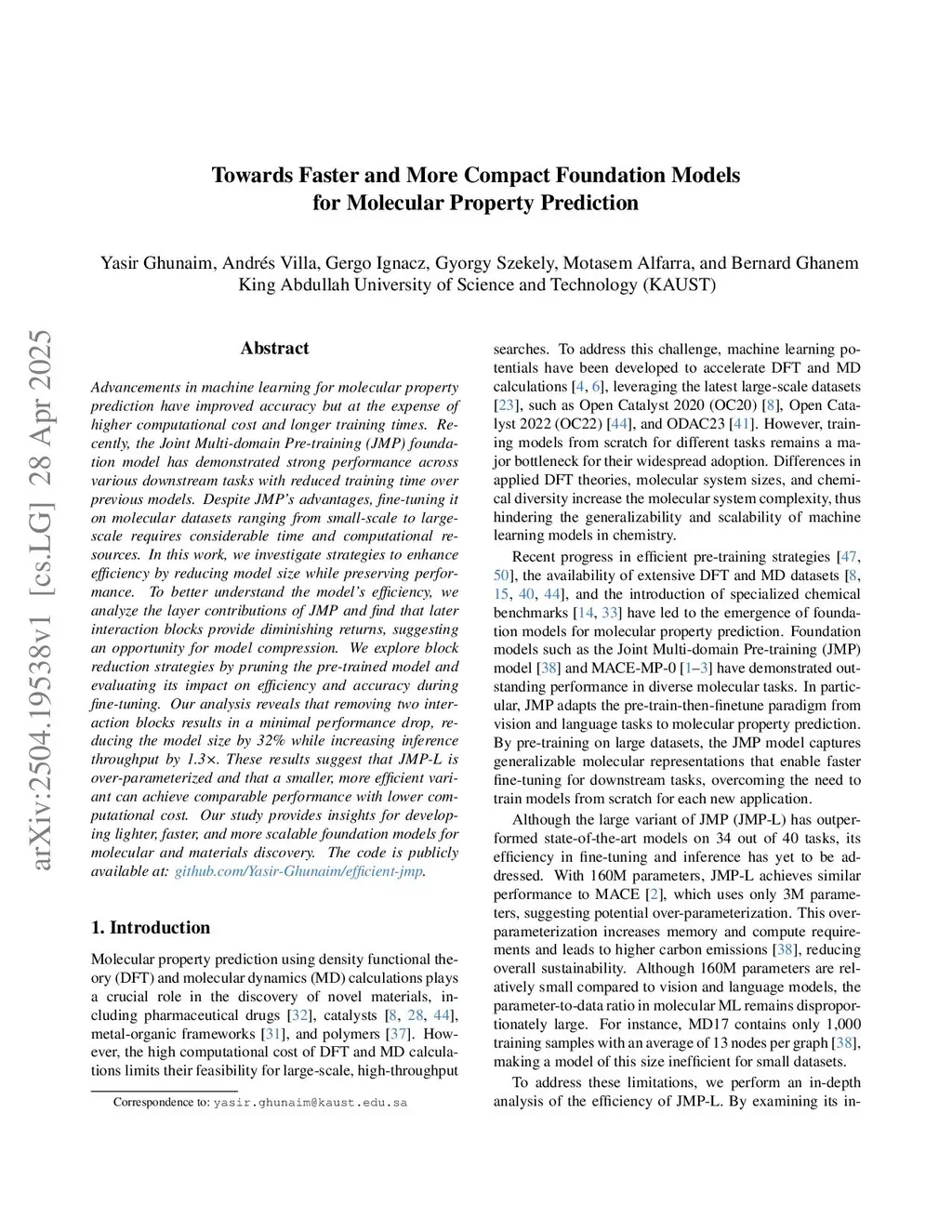 Advancements in machine learning for molecular property prediction have improved accuracy but at the expense of higher computational cost and longer training times. Recently, the Joint Multi-domain Pre-training (JMP) foundation model has demonstrated strong performance across various downstream tasks with reduced training time over previous models. Despite JMP's advantages, fine-tuning it on molecular datasets ranging from small-scale to large-scale requires considerable time and computational resources. In this work, we investigate strategies to enhance efficiency by reducing model size while preserving performance. To better understand the model's efficiency, we analyze the layer contributions of JMP and find that later interaction blocks provide diminishing returns, suggesting an opportunity for model compression. We explore block reduction strategies by pruning the pre-trained model and evaluating its impact on efficiency and accuracy during fine-tuning. Our analysis reveals that removing two interaction blocks results in a minimal performance drop, reducing the model size by 32% while increasing inference throughput by 1.3x. These results suggest that JMP-L is over-parameterized and that a smaller, more efficient variant can achieve comparable performance with lower computational cost. Our study provides insights for developing lighter, faster, and more scalable foundation models for molecular and materials discovery. The code is publicly available at:this https URL.