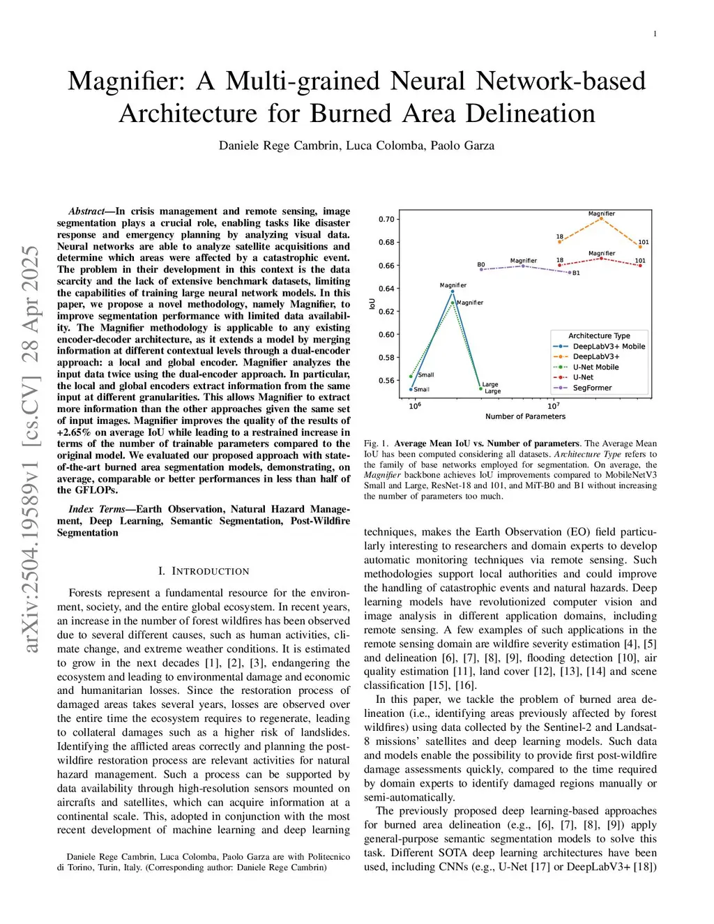 In crisis management and remote sensing, image segmentation plays a crucial role, enabling tasks like disaster response and emergency planning by analyzing visual data. Neural networks are able to analyze satellite acquisitions and determine which areas were affected by a catastrophic event. The problem in their development in this context is the data scarcity and the lack of extensive benchmark datasets, limiting the capabilities of training large neural network models. In this paper, we propose a novel methodology, namely Magnifier, to improve segmentation performance with limited data availability. The Magnifier methodology is applicable to any existing encoder-decoder architecture, as it extends a model by merging information at different contextual levels through a dual-encoder approach: a local and global encoder. Magnifier analyzes the input data twice using the dual-encoder approach. In particular, the local and global encoders extract information from the same input at different granularities. This allows Magnifier to extract more information than the other approaches given the same set of input images. Magnifier improves the quality of the results of +2.65% on average IoU while leading to a restrained increase in terms of the number of trainable parameters compared to the original model. We evaluated our proposed approach with state-of-the-art burned area segmentation models, demonstrating, on average, comparable or better performances in less than half of the GFLOPs.