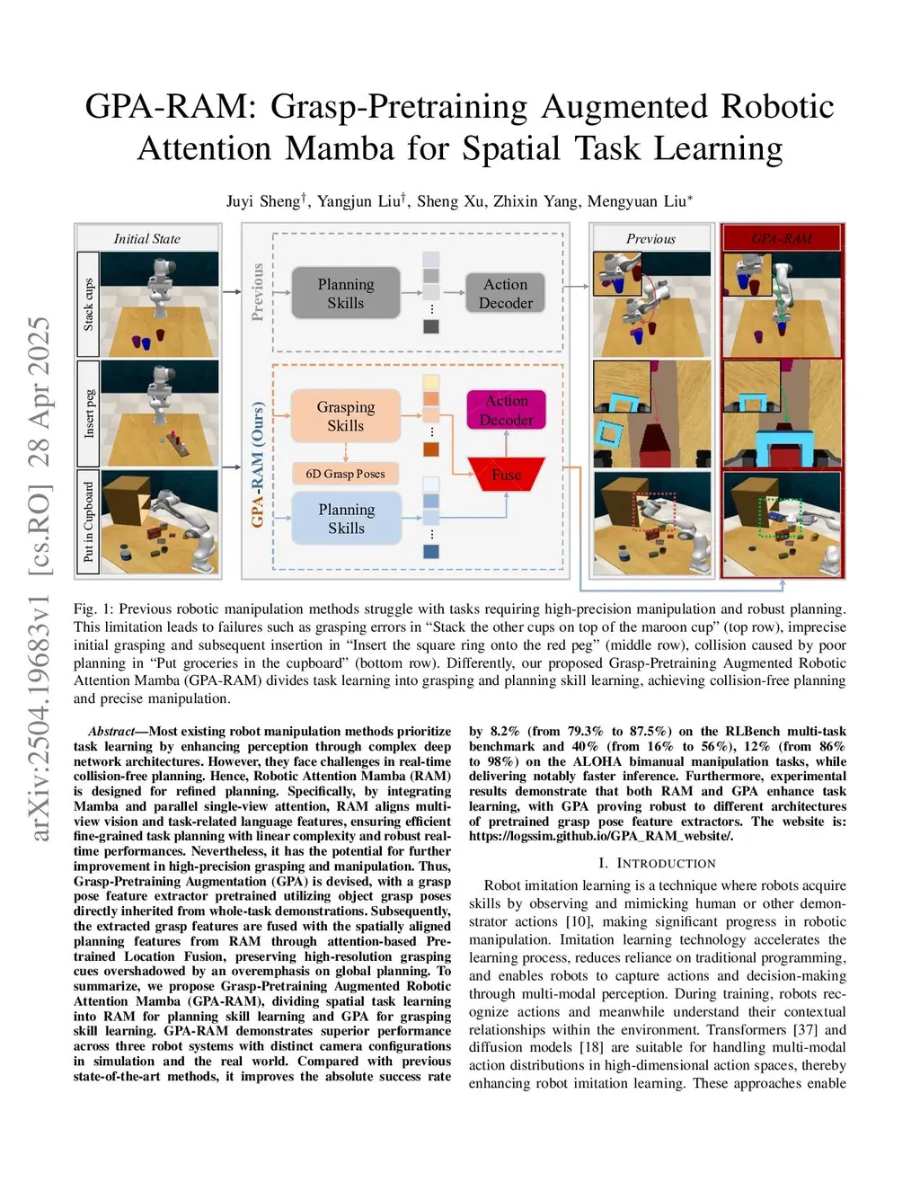 Task failures in prior fine-grained robotic manipulation methods often stem from suboptimal initial grasping, which is critical for subsequent manipulation and reducing the requirement for complex pose adjustments. To address this, we propose Grasp-Pretraining Augmentation (GPA), a general multi-modal learning framework that enhances grasp perception without additional grasp pose data collection and labeling. GPA achieves evident enhancement on RLBench multi-task benchmark (from 79.3% to 84.2%) and ALOHA bimanual manipulation tasks (from 86%/16% to 98%/38%). Although GPA enhances fine-grained grasping performance by leveraging increased model capacity, it incurs computational latency and hinders real-time deployment. To mitigate this limitation, we propose Robotic Attention Mamba (RAM). This architecture synergizes attention mechanisms with state space models (SSMs), effectively capturing complex spatial features while maintaining superior inference efficiency. Our unified GPA-RAM framework balances model capacity with efficiency and applies to both discrete and continuous action generation. GPA-RAM demonstrates superior performance across four robotic systems with diverse camera configurations in both simulation and the real world. Compared with previous state-of-the-art methods, it improves average success rates by 8.2% over RVT2 (from 79.3% to 87.5%) and 2.6% over ARP^+ (from 84.9% to 87.5%) on the RLBench multi-task benchmark and 40% (from 16% to 56%), 12% (from 86% to 98%) on ALOHA bimanual continuous tasks, with inference speed of about 71 FPS. This work provides a framework for developing robotic systems that are simultaneously precise and responsive. The project and code are atthis https URL