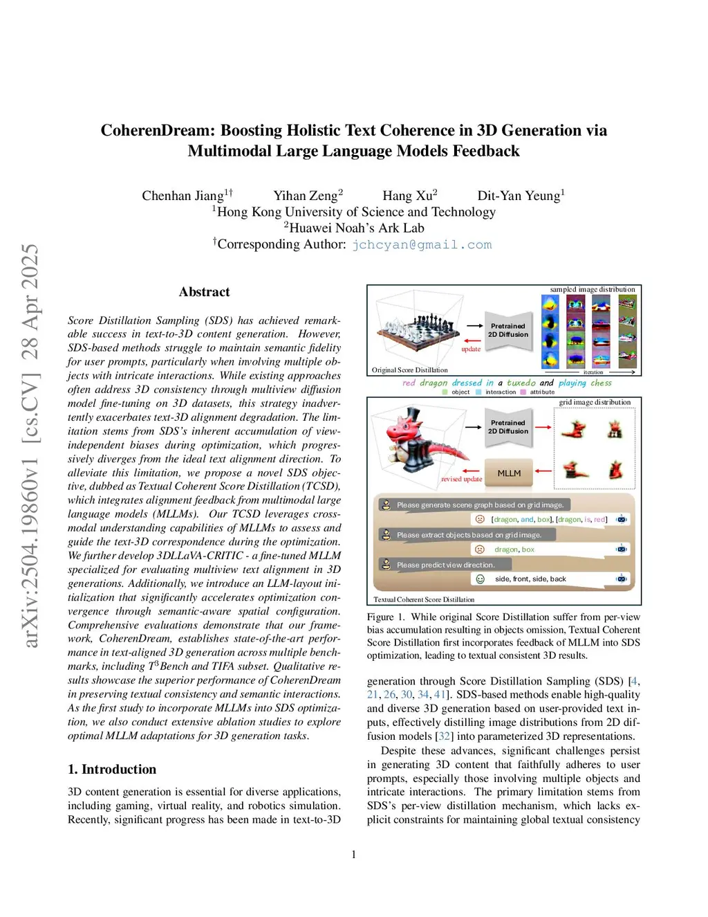Score Distillation Sampling (SDS) has achieved remarkable success in text-to-3D content generation. However, SDS-based methods struggle to maintain semantic fidelity for user prompts, particularly when involving multiple objects with intricate interactions. While existing approaches often address 3D consistency through multiview diffusion model fine-tuning on 3D datasets, this strategy inadvertently exacerbates text-3D alignment degradation. The limitation stems from SDS's inherent accumulation of view-independent biases during optimization, which progressively diverges from the ideal text alignment direction. To alleviate this limitation, we propose a novel SDS objective, dubbed as Textual Coherent Score Distillation (TCSD), which integrates alignment feedback from multimodal large language models (MLLMs). Our TCSD leverages cross-modal understanding capabilities of MLLMs to assess and guide the text-3D correspondence during the optimization. We further develop 3DLLaVA-CRITIC - a fine-tuned MLLM specialized for evaluating multiview text alignment in 3D generations. Additionally, we introduce an LLM-layout initialization that significantly accelerates optimization convergence through semantic-aware spatial configuration. Our framework, CoherenDream, achieves consistent improvement across multiple metrics on TIFAthis http URLthe first study to incorporate MLLMs into SDS optimization, we also conduct extensive ablation studies to explore optimal MLLM adaptations for 3D generation tasks.
