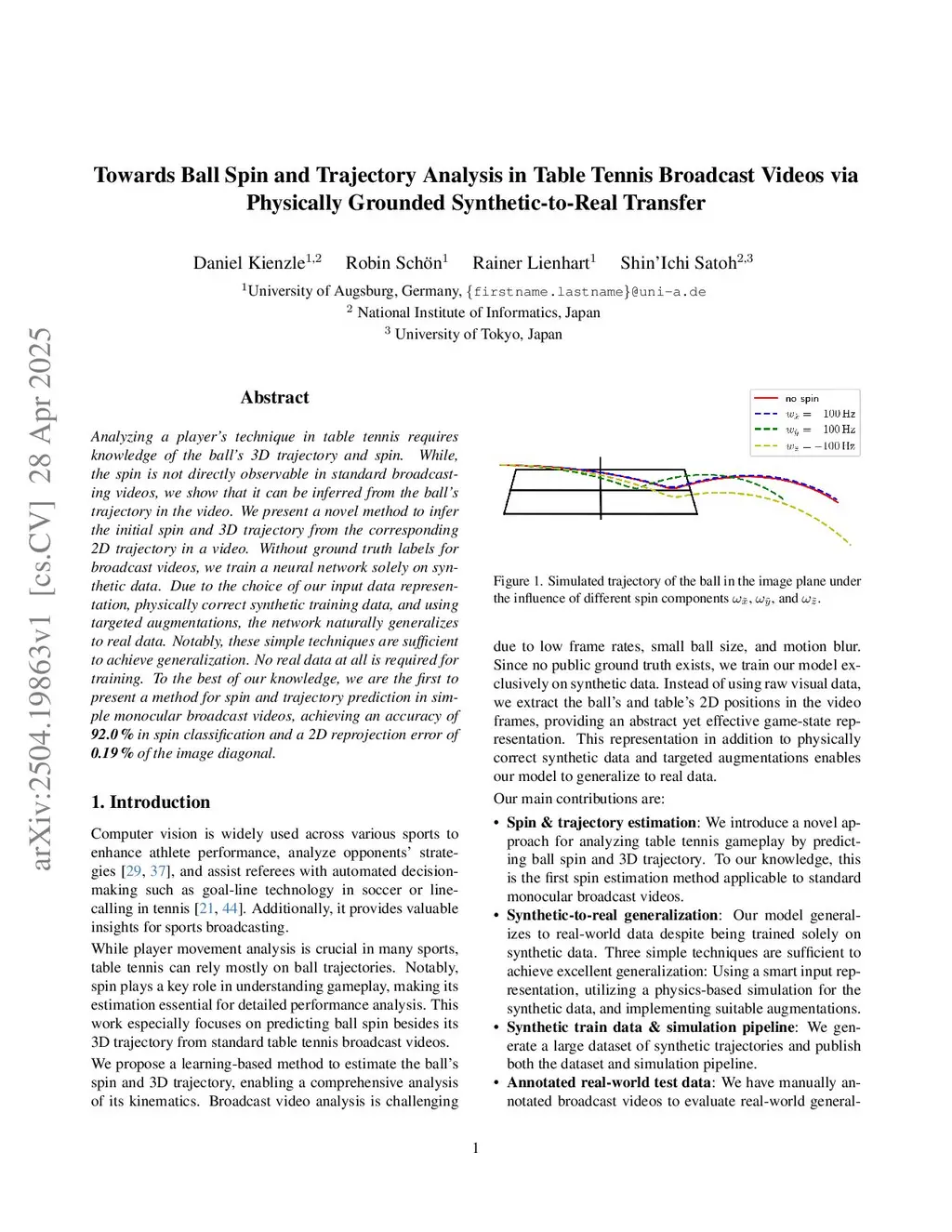 Analyzing a player's technique in table tennis requires knowledge of the ball's 3D trajectory and spin. While, the spin is not directly observable in standard broadcasting videos, we show that it can be inferred from the ball's trajectory in the video. We present a novel method to infer the initial spin and 3D trajectory from the corresponding 2D trajectory in a video. Without ground truth labels for broadcast videos, we train a neural network solely on synthetic data. Due to the choice of our input data representation, physically correct synthetic training data, and using targeted augmentations, the network naturally generalizes to real data. Notably, these simple techniques are sufficient to achieve generalization. No real data at all is required for training. To the best of our knowledge, we are the first to present a method for spin and trajectory prediction in simple monocular broadcast videos, achieving an accuracy of 92.0% in spin classification and a 2D reprojection error of 0.19% of the image diagonal.