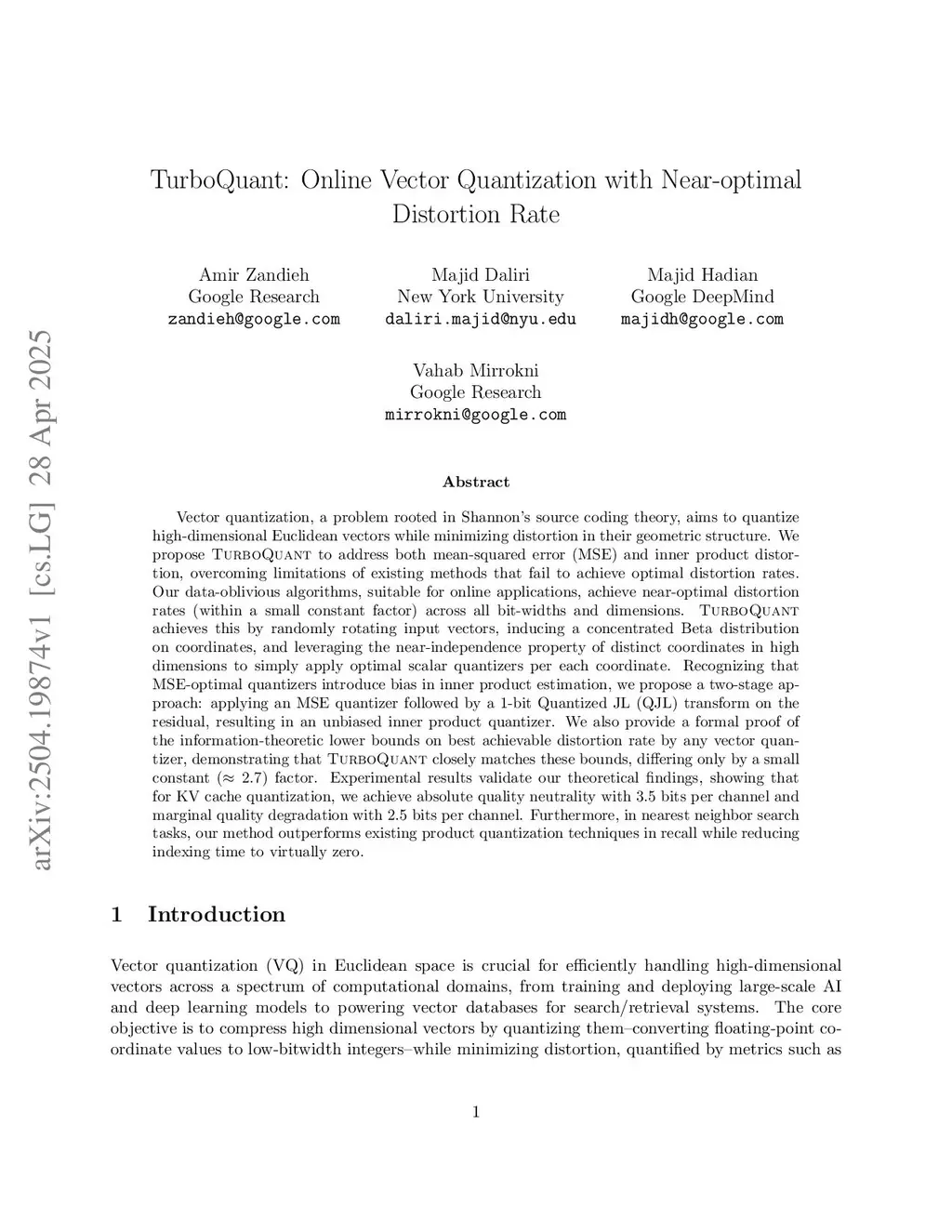 Vector quantization, a problem rooted in Shannon's source coding theory, aims to quantize high-dimensional Euclidean vectors while minimizing distortion in their geometric structure. We propose TurboQuant to address both mean-squared error (MSE) and inner product distortion, overcoming limitations of existing methods that fail to achieve optimal distortion rates. Our data-oblivious algorithms, suitable for online applications, achieve near-optimal distortion rates (within a small constant factor) across all bit-widths and dimensions. TurboQuant achieves this by randomly rotating input vectors, inducing a concentrated Beta distribution on coordinates, and leveraging the near-independence property of distinct coordinates in high dimensions to simply apply optimal scalar quantizers per each coordinate. Recognizing that MSE-optimal quantizers introduce bias in inner product estimation, we propose a two-stage approach: applying an MSE quantizer followed by a 1-bit Quantized JL (QJL) transform on the residual, resulting in an unbiased inner product quantizer. We also provide a formal proof of the information-theoretic lower bounds on best achievable distortion rate by any vector quantizer, demonstrating that TurboQuant closely matches these bounds, differing only by a small constant () factor. Experimental results validate our theoretical findings, showing that for KV cache quantization, we achieve absolute quality neutrality with 3.5 bits per channel and marginal quality degradation with 2.5 bits per channel. Furthermore, in nearest neighbor search tasks, our method outperforms existing product quantization techniques in recall while reducing indexing time to virtually zero.