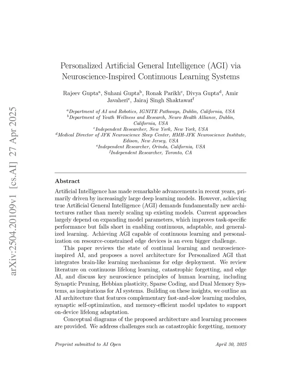 Artificial Intelligence has made remarkable advancements in recent years, primarily driven by increasingly large deep learning models. However, achieving true Artificial General Intelligence (AGI) demands fundamentally new architectures rather than merely scaling up existing models. Current approaches largely depend on expanding model parameters, which improves task-specific performance but falls short in enabling continuous, adaptable, and generalized learning. Achieving AGI capable of continuous learning and personalization on resource-constrained edge devices is an even bigger challenge.This paper reviews the state of continual learning and neuroscience-inspired AI, and proposes a novel architecture for Personalized AGI that integrates brain-like learning mechanisms for edge deployment. We review literature on continuous lifelong learning, catastrophic forgetting, and edge AI, and discuss key neuroscience principles of human learning, including Synaptic Pruning, Hebbian plasticity, Sparse Coding, and Dual Memory Systems, as inspirations for AI systems. Building on these insights, we outline an AI architecture that features complementary fast-and-slow learning modules, synaptic self-optimization, and memory-efficient model updates to support on-device lifelong adaptation.Conceptual diagrams of the proposed architecture and learning processes are provided. We address challenges such as catastrophic forgetting, memory efficiency, and system scalability, and present application scenarios for mobile AI assistants and embodied AI systems like humanoid robots. We conclude with key takeaways and future research directions toward truly continual, personalized AGI on the edge. While the architecture is theoretical, it synthesizes diverse findings and offers a roadmap for future implementation.