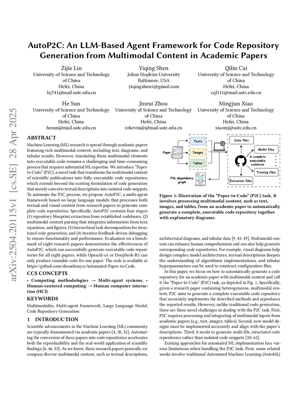 Machine Learning (ML) research is spread through academic papers featuring rich multimodal content, including text, diagrams, and tabular results. However, translating these multimodal elements into executable code remains a challenging and time-consuming process that requires substantial ML expertise. We introduce ``Paper-to-Code'' (P2C), a novel task that transforms the multimodal content of scientific publications into fully executable code repositories, which extends beyond the existing formulation of code generation that merely converts textual descriptions into isolated code snippets. To automate the P2C process, we propose AutoP2C, a multi-agent framework based on large language models that processes both textual and visual content from research papers to generate complete code repositories. Specifically, AutoP2C contains four stages: (1) repository blueprint extraction from established codebases, (2) multimodal content parsing that integrates information from text, equations, and figures, (3) hierarchical task decomposition for structured code generation, and (4) iterative feedback-driven debugging to ensure functionality and performance. Evaluation on a benchmark of eight research papers demonstrates the effectiveness of AutoP2C, which can successfully generate executable code repositories for all eight papers, while OpenAI-o1 or DeepSeek-R1 can only produce runnable code for one paper. The code is available atthis https URL.