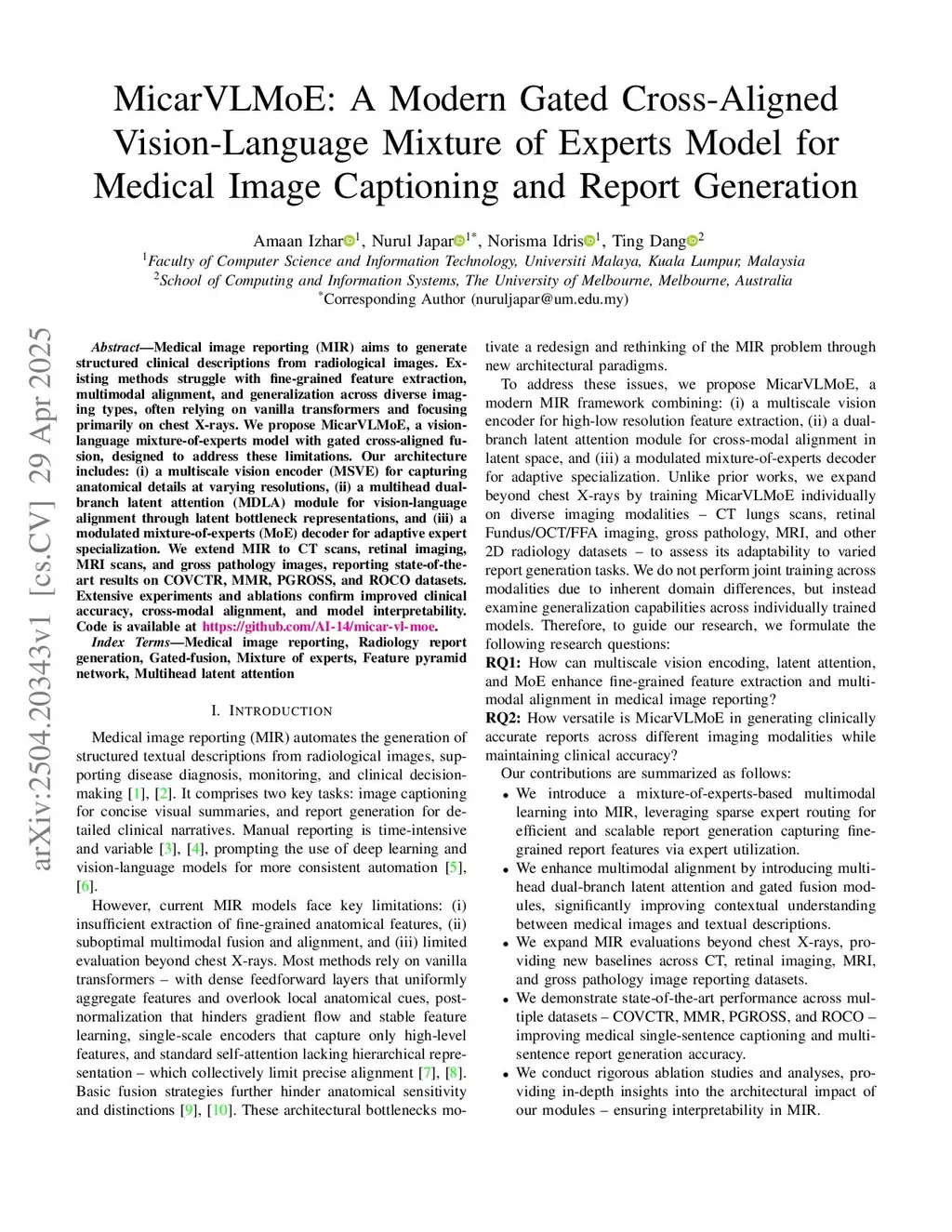 Medical image reporting (MIR) aims to generate structured clinical descriptions from radiological images. Existing methods struggle with fine-grained feature extraction, multimodal alignment, and generalization across diverse imaging types, often relying on vanilla transformers and focusing primarily on chest X-rays. We propose MicarVLMoE, a vision-language mixture-of-experts model with gated cross-aligned fusion, designed to address these limitations. Our architecture includes: (i) a multiscale vision encoder (MSVE) for capturing anatomical details at varying resolutions, (ii) a multihead dual-branch latent attention (MDLA) module for vision-language alignment through latent bottleneck representations, and (iii) a modulated mixture-of-experts (MoE) decoder for adaptive expert specialization. We extend MIR to CT scans, retinal imaging, MRI scans, and gross pathology images, reporting state-of-the-art results on COVCTR, MMR, PGROSS, and ROCO datasets. Extensive experiments and ablations confirm improved clinical accuracy, cross-modal alignment, and model interpretability. Code is available atthis https URL.