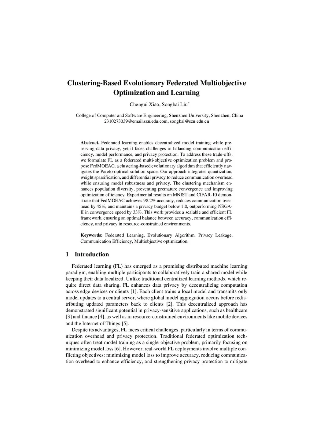 Federated learning enables decentralized model training while preserving data privacy, yet it faces challenges in balancing communication efficiency, model performance, and privacy protection. To address these trade-offs, we formulate FL as a federated multiobjective optimization problem and propose FedMOEAC, a clustering-based evolutionary algorithm that efficiently navigates the Pareto-optimal solution space. Our approach integrates quantization, weight sparsification, and differential privacy to reduce communication overhead while ensuring model robustness and privacy. The clustering mechanism en-hances population diversity, preventing premature convergence and improving optimization efficiency. Experimental results on MNIST and CIFAR-10 demonstrate that FedMOEAC achieves 98.2% accuracy, reduces communication overhead by 45%, and maintains a privacy budget below 1.0, outperforming NSGA-II in convergence speed by 33%. This work provides a scalable and efficient FL framework, ensuring an optimal balance between accuracy, communication efficiency, and privacy in resource-constrained environments.