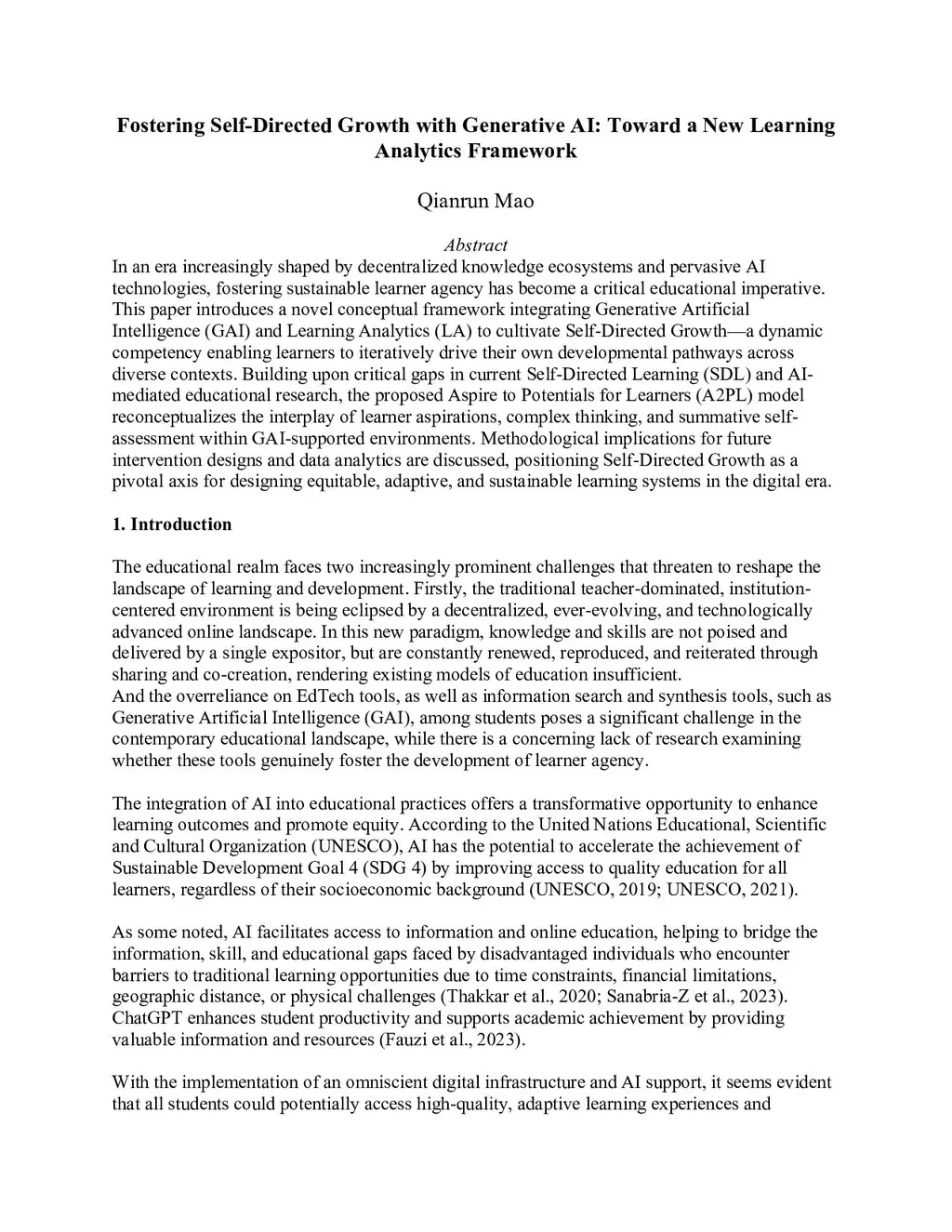 In an era increasingly shaped by decentralized knowledge ecosystems and pervasive AI technologies, fostering sustainable learner agency has become a critical educational imperative. This study introduces a novel conceptual framework integrating Generative Artificial Intelligence and Learning Analytics to cultivate Self-Directed Growth, a dynamic competency that enables learners to iteratively drive their own developmental pathways across diversethis http URLupon critical gaps in current research on Self Directed Learning and AI-mediated education, the proposed Aspire to Potentials for Learners (A2PL) model reconceptualizes the interplay of learner aspirations, complex thinking, and summative self-assessment within GAI supportedthis http URLimplications for future intervention design and learning analytics applications are discussed, positioning Self-Directed Growth as a pivotal axis for developing equitable, adaptive, and sustainable learning systems in the digital era.