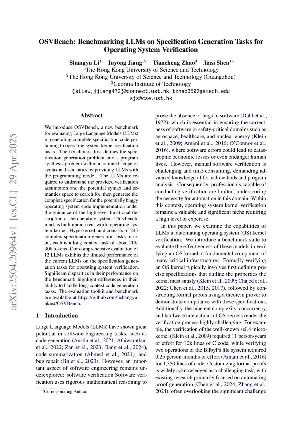 OSVBench: Benchmarking LLMs on Specification Generation Tasks for Operating System Verification
