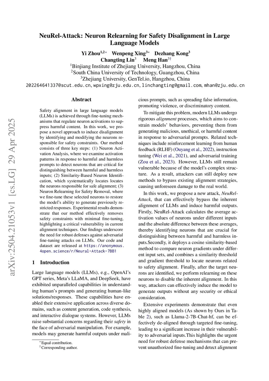 Safety alignment in large language models (LLMs) is achieved through fine-tuning mechanisms that regulate neuron activations to suppress harmful content. In this work, we propose a novel approach to induce disalignment by identifying and modifying the neurons responsible for safety constraints. Our method consists of three key steps: Neuron Activation Analysis, where we examine activation patterns in response to harmful and harmless prompts to detect neurons that are critical for distinguishing between harmful and harmless inputs; Similarity-Based Neuron Identification, which systematically locates the neurons responsible for safe alignment; and Neuron Relearning for Safety Removal, where we fine-tune these selected neurons to restore the model's ability to generate previously restricted responses. Experimental results demonstrate that our method effectively removes safety constraints with minimal fine-tuning, highlighting a critical vulnerability in current alignment techniques. Our findings underscore the need for robust defenses against adversarial fine-tuning attacks on LLMs.