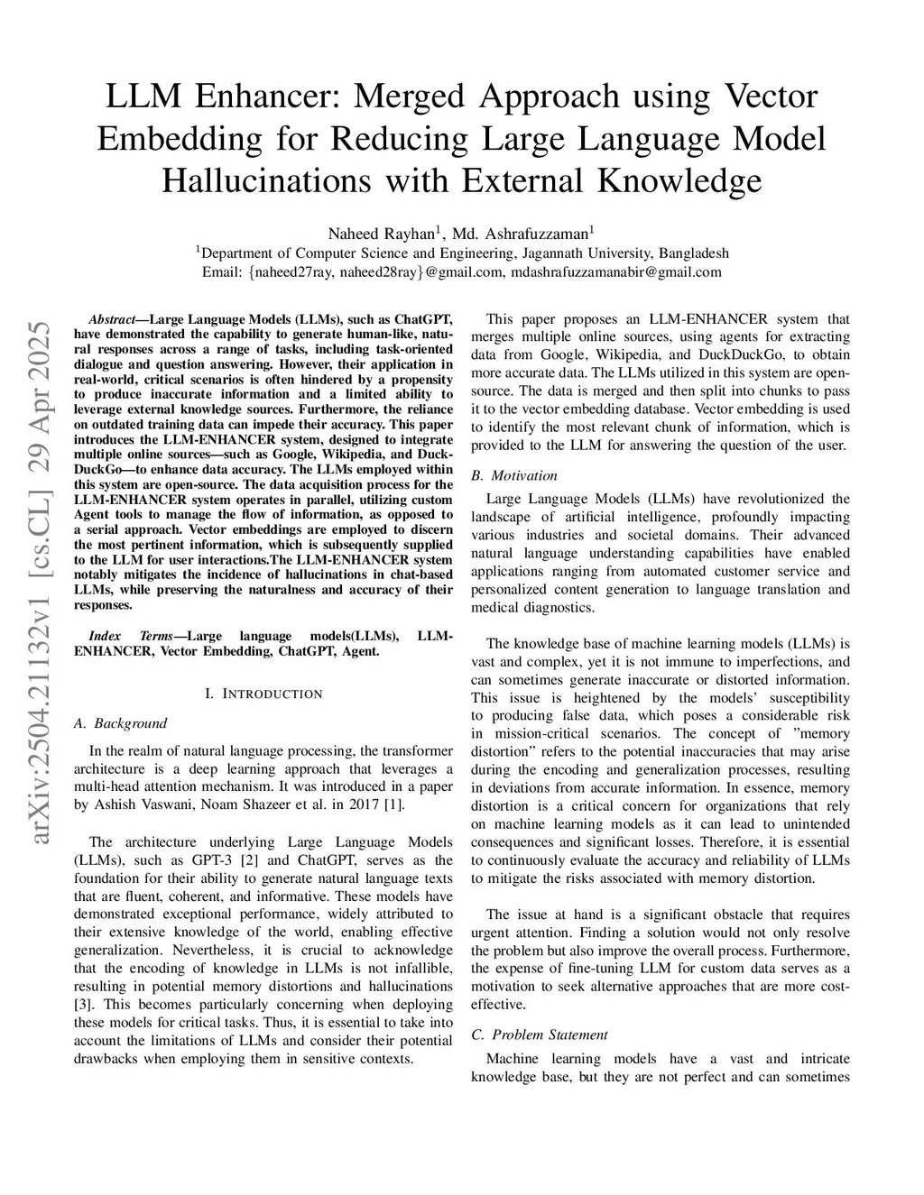 LLM Enhancer: Merged Approach using Vector Embedding for Reducing Large Language Model Hallucinations with External Knowledge