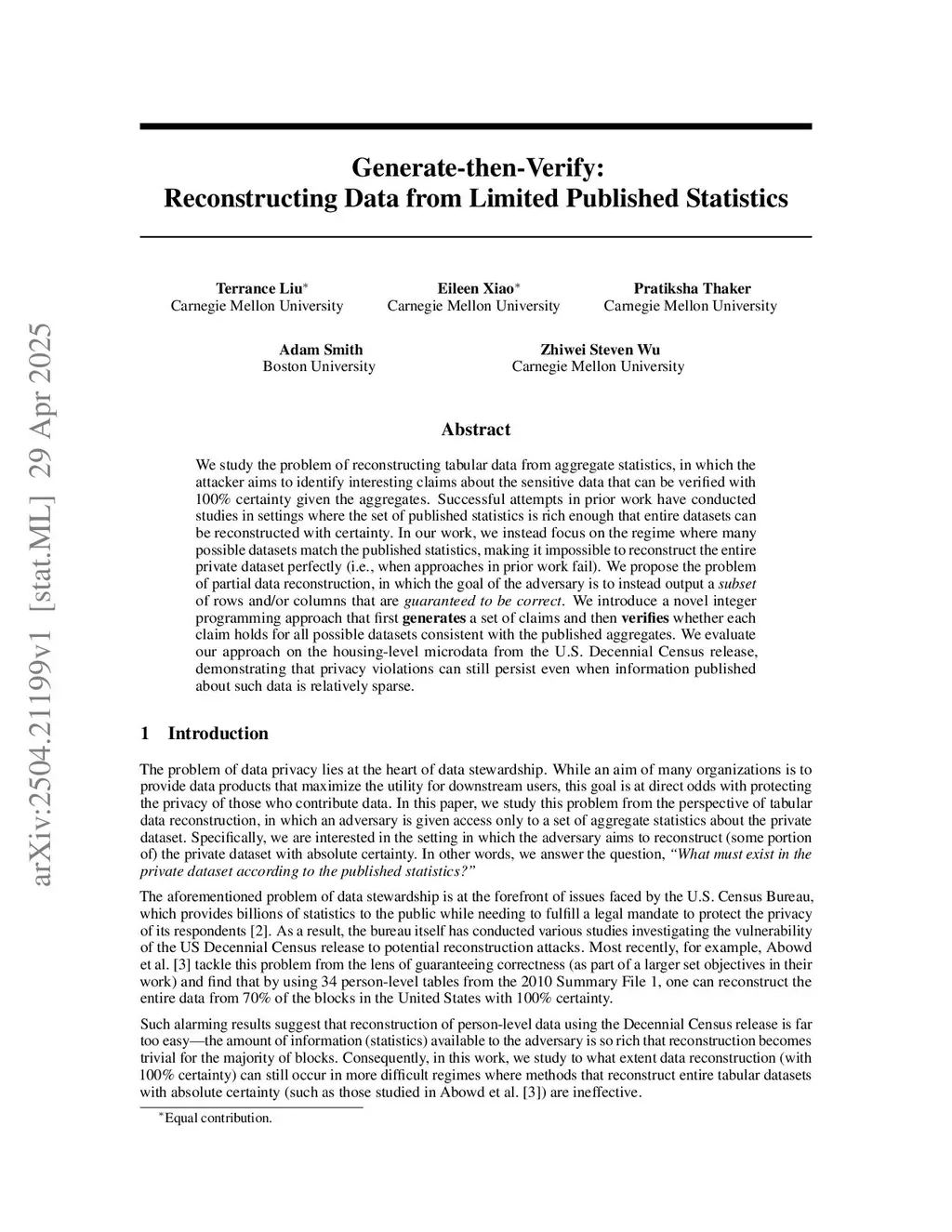 We study the problem of reconstructing tabular data from aggregate statistics, in which the attacker aims to identify interesting claims about the sensitive data that can be verified with 100% certainty given the aggregates. Successful attempts in prior work have conducted studies in settings where the set of published statistics is rich enough that entire datasets can be reconstructed with certainty. In our work, we instead focus on the regime where many possible datasets match the published statistics, making it impossible to reconstruct the entire private dataset perfectly (i.e., when approaches in prior work fail). We propose the problem of partial data reconstruction, in which the goal of the adversary is to instead output a of rows and/or columns that are . We introduce a novel integer programming approach that first a set of claims and then whether each claim holds for all possible datasets consistent with the published aggregates. We evaluate our approach on the housing-level microdata from the U.S. Decennial Census release, demonstrating that privacy violations can still persist even when information published about such data is relatively sparse.