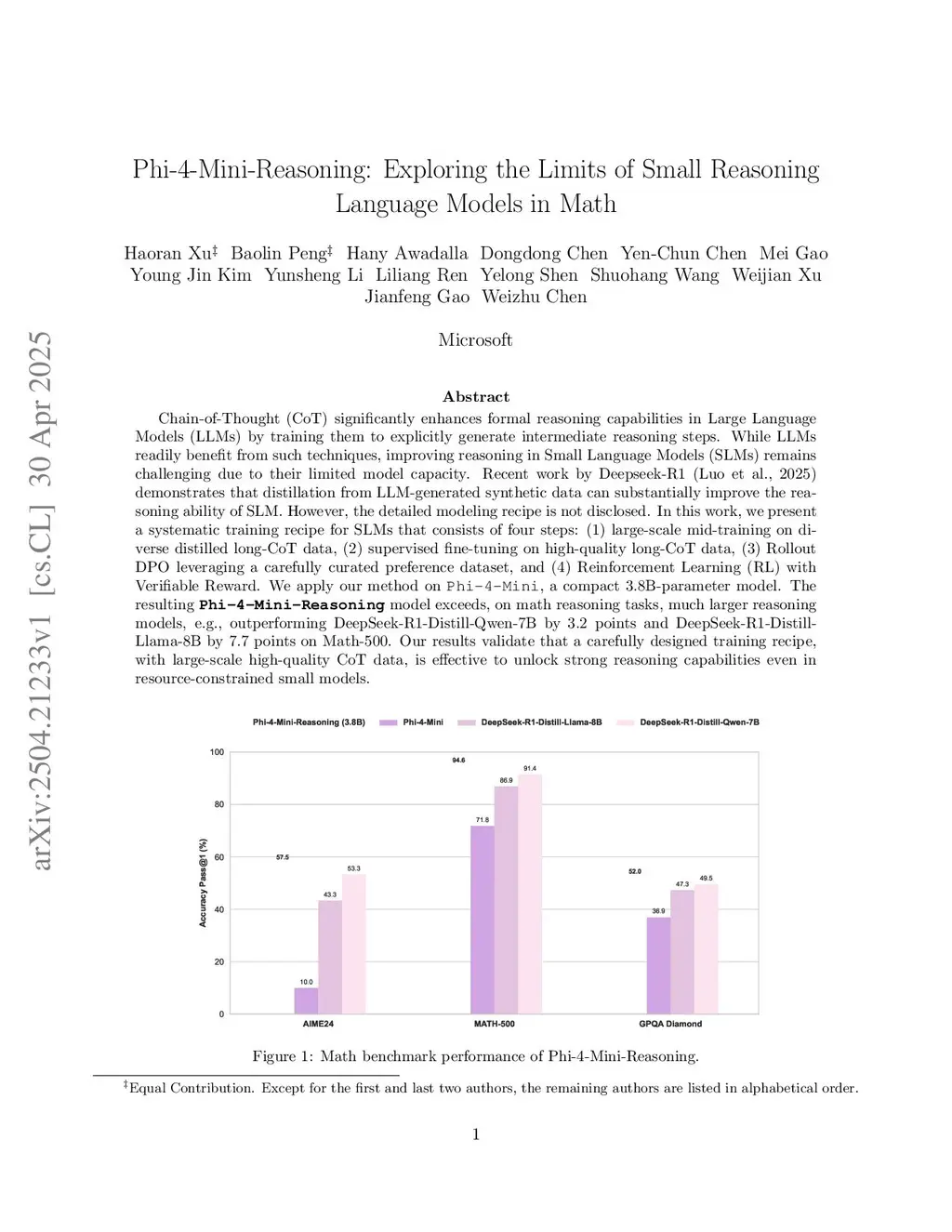 Chain-of-Thought (CoT) significantly enhances formal reasoning capabilities in Large Language Models (LLMs) by training them to explicitly generate intermediate reasoning steps. While LLMs readily benefit from such techniques, improving reasoning in Small Language Models (SLMs) remains challenging due to their limited model capacity. Recent work by Deepseek-R1 demonstrates that distillation from LLM-generated synthetic data can substantially improve the reasoning ability of SLM. However, the detailed modeling recipe is not disclosed. In this work, we present a systematic training recipe for SLMs that consists of four steps: (1) large-scale mid-training on diverse distilled long-CoT data, (2) supervised fine-tuning on high-quality long-CoT data, (3) Rollout DPO leveraging a carefully curated preference dataset, and (4) Reinforcement Learning (RL) with Verifiable Reward. We apply our method on Phi-4-Mini, a compact 3.8B-parameter model. The resulting Phi-4-Mini-Reasoning model exceeds, on math reasoning tasks, much larger reasoning models, e.g., outperforming DeepSeek-R1-Distill-Qwen-7B by 3.2 points and DeepSeek-R1-Distill-Llama-8B by 7.7 points on Math-500. Our results validate that a carefully designed training recipe, with large-scale high-quality CoT data, is effective to unlock strong reasoning capabilities even in resource-constrained small models.