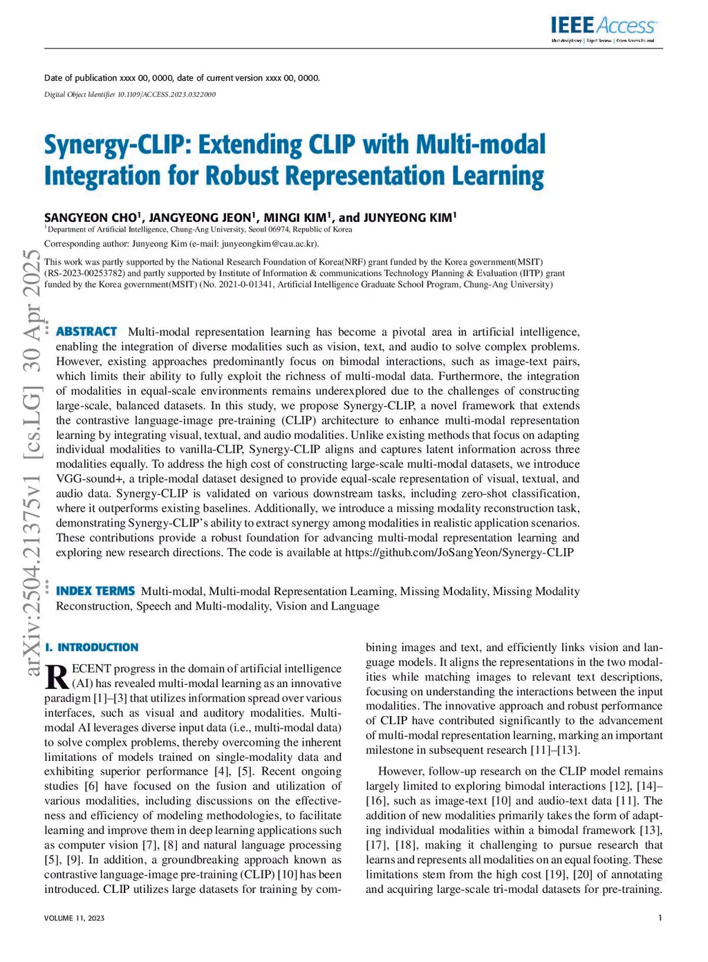 Multi-modal representation learning has become a pivotal area in artificial intelligence, enabling the integration of diverse modalities such as vision, text, and audio to solve complex problems. However, existing approaches predominantly focus on bimodal interactions, such as image-text pairs, which limits their ability to fully exploit the richness of multi-modal data. Furthermore, the integration of modalities in equal-scale environments remains underexplored due to the challenges of constructing large-scale, balanced datasets. In this study, we propose Synergy-CLIP, a novel framework that extends the contrastive language-image pre-training (CLIP) architecture to enhance multi-modal representation learning by integrating visual, textual, and audio modalities. Unlike existing methods that focus on adapting individual modalities to vanilla-CLIP, Synergy-CLIP aligns and captures latent information across three modalities equally. To address the high cost of constructing large-scale multi-modal datasets, we introduce VGG-sound+, a triple-modal dataset designed to provide equal-scale representation of visual, textual, and audio data. Synergy-CLIP is validated on various downstream tasks, including zero-shot classification, where it outperforms existing baselines. Additionally, we introduce a missing modality reconstruction task, demonstrating Synergy-CLIP's ability to extract synergy among modalities in realistic application scenarios. These contributions provide a robust foundation for advancing multi-modal representation learning and exploring new research directions.