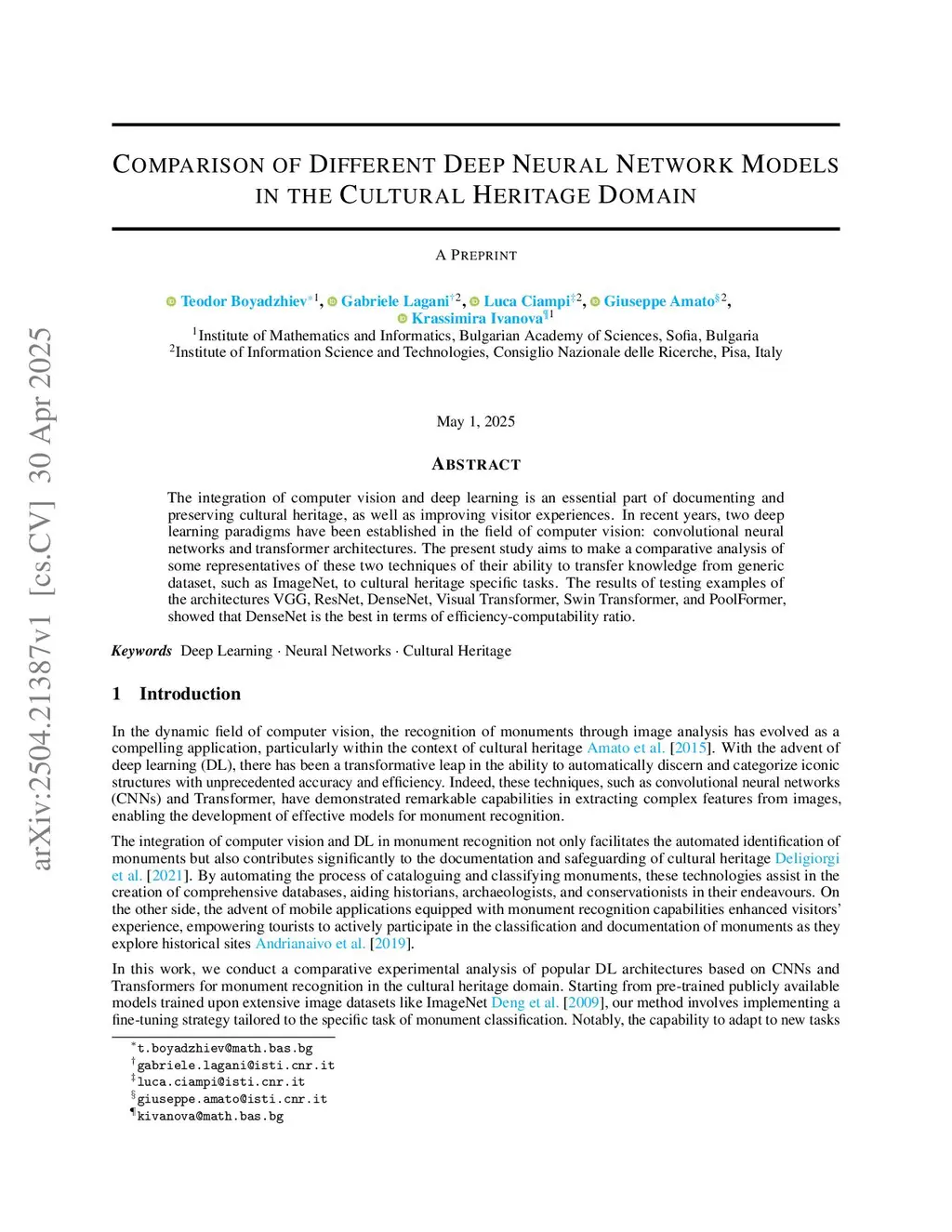 Comparison of Different Deep Neural Network Models in the Cultural Heritage Domain