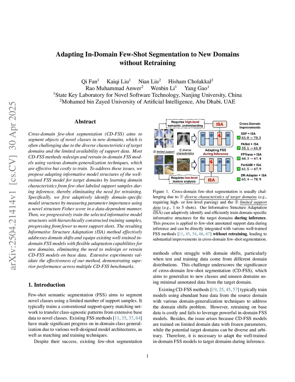 Cross-domain few-shot segmentation (CD-FSS) aims to segment objects of novel classes in new domains, which is often challenging due to the diverse characteristics of target domains and the limited availability of support data. Most CD-FSS methods redesign and retrain in-domain FSS models using abundant base data from the source domain, which are effective but costly to train. To address these issues, we propose adapting informative model structures of the well-trained FSS model for target domains by learning domain characteristics from few-shot labeled support samples during inference, thereby eliminating the need for source domain retraining. Specifically, we first adaptively identify domain-specific model structures by measuring parameter importance using a novel structure Fisher score in a data-dependent manner. Then, we progressively train the selected informative model structures with hierarchically constructed training samples, progressing from fewer to more support shots. The resulting Informative Structure Adaptation (ISA) method effectively addresses domain shifts and equips existing well-trained in-domain FSS models with flexible adaptation capabilities for new domains, eliminating the need to redesign or retrain CD-FSS models on base data. Extensive experiments validate the effectiveness of our method, demonstrating superior performance across multiple CD-FSS benchmarks. Codes are atthis https URL.