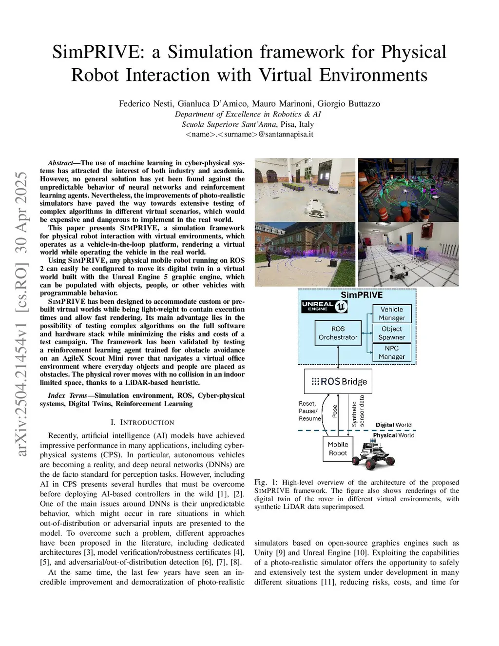 The use of machine learning in cyber-physical systems has attracted the interest of both industry and academia. However, no general solution has yet been found against the unpredictable behavior of neural networks and reinforcement learning agents. Nevertheless, the improvements of photo-realistic simulators have paved the way towards extensive testing of complex algorithms in different virtual scenarios, which would be expensive and dangerous to implement in the real world.This paper presents SimPRIVE, a simulation framework for physical robot interaction with virtual environments, which operates as a vehicle-in-the-loop platform, rendering a virtual world while operating the vehicle in the real world.Using SimPRIVE, any physical mobile robot running on ROS 2 can easily be configured to move its digital twin in a virtual world built with the Unreal Engine 5 graphic engine, which can be populated with objects, people, or other vehicles with programmable behavior.SimPRIVE has been designed to accommodate custom or pre-built virtual worlds while being light-weight to contain execution times and allow fast rendering. Its main advantage lies in the possibility of testing complex algorithms on the full software and hardware stack while minimizing the risks and costs of a test campaign. The framework has been validated by testing a reinforcement learning agent trained for obstacle avoidance on an AgileX Scout Mini rover that navigates a virtual office environment where everyday objects and people are placed as obstacles. The physical rover moves with no collision in an indoor limited space, thanks to a LiDAR-based heuristic.