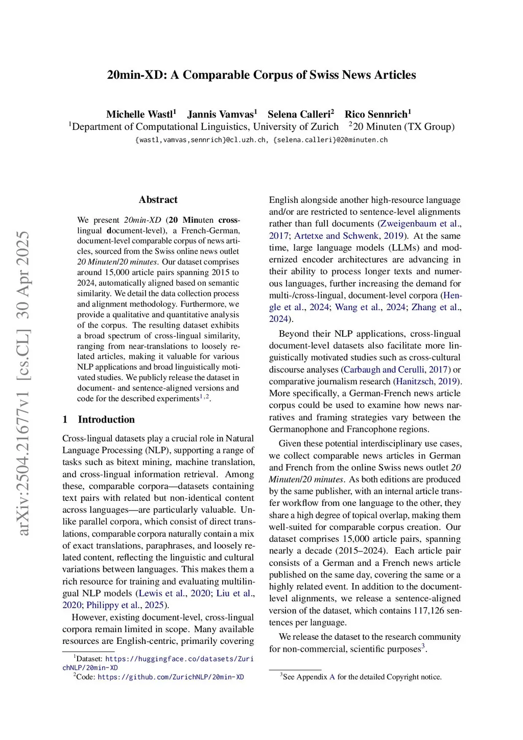 20min-XD: A Comparable Corpus of Swiss News Articles