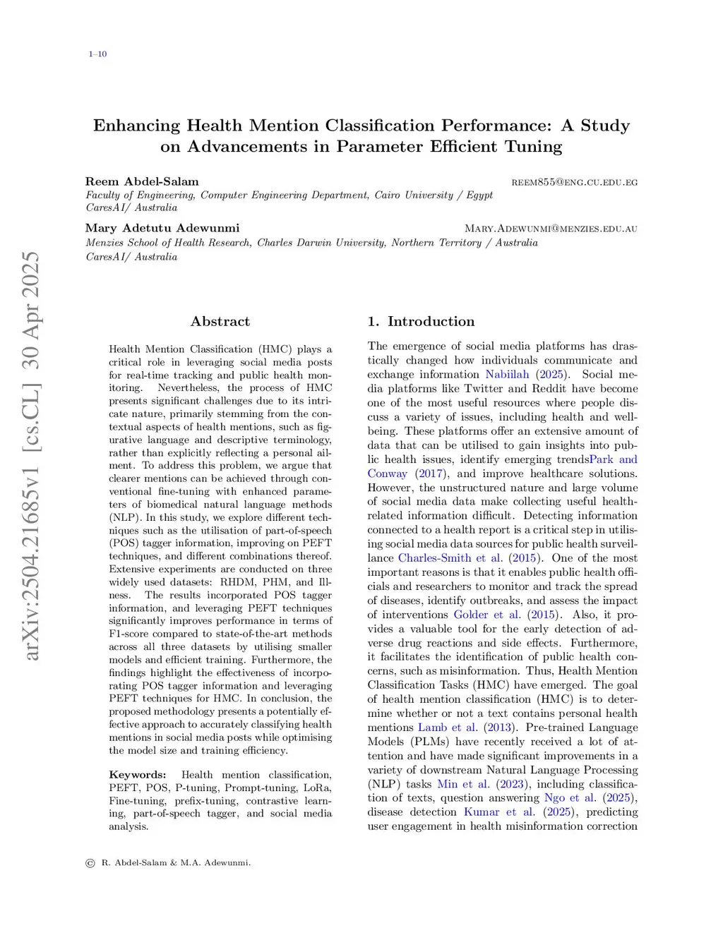 Health Mention Classification (HMC) plays a critical role in leveraging social media posts for real-time tracking and public health monitoring. Nevertheless, the process of HMC presents significant challenges due to its intricate nature, primarily stemming from the contextual aspects of health mentions, such as figurative language and descriptive terminology, rather than explicitly reflecting a personal ailment. To address this problem, we argue that clearer mentions can be achieved through conventional fine-tuning with enhanced parameters of biomedical natural language methods (NLP). In this study, we explore different techniques such as the utilisation of part-of-speech (POS) tagger information, improving on PEFT techniques, and different combinations thereof. Extensive experiments are conducted on three widely used datasets: RHDM, PHM, and Illness. The results incorporated POS tagger information, and leveraging PEFT techniques significantly improves performance in terms of F1-score compared to state-of-the-art methods across all three datasets by utilising smaller models and efficient training. Furthermore, the findings highlight the effectiveness of incorporating POS tagger information and leveraging PEFT techniques for HMC. In conclusion, the proposed methodology presents a potentially effective approach to accurately classifying health mentions in social media posts while optimising the model size and training efficiency.