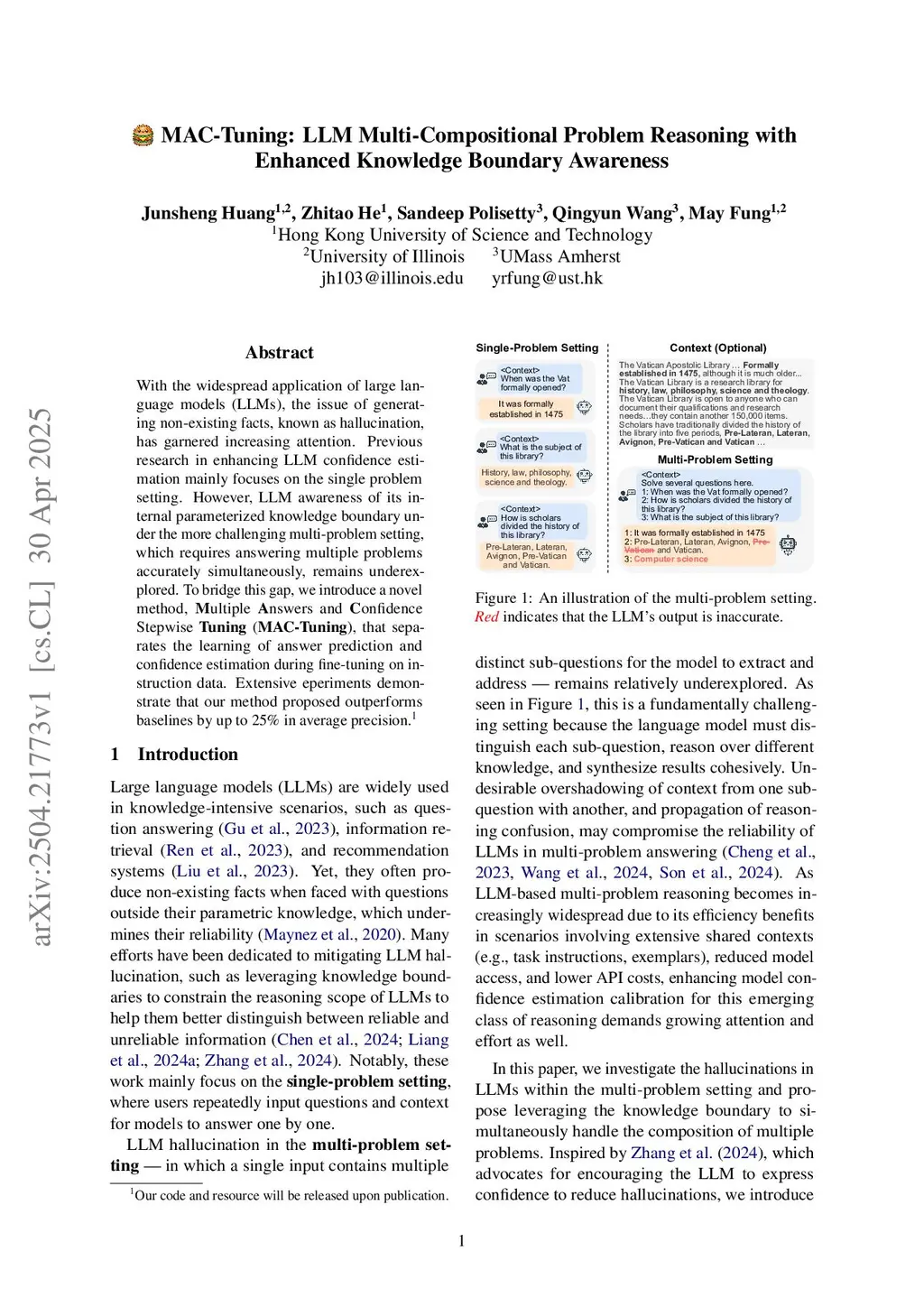 The hallucination of non-existent facts by LLMs is an important problem given its widespread adoption across various applications. Previous research addresses this problem by analyzing the internal parameterized knowledge boundaries to estimate confidence. However, these studies focus on the single-problem setting and have not explored the more challenging multi-problem setting, which requires accurately answering multiple questions simultaneously. We introduce a novel method for the multi-problem setting, Multiple Answers and Confidence Stepwise Tuning (MAC-Tuning), that separates the learning of answer prediction and confidence estimation during fine-tuning on instruction data. Extensive experiments demonstrate that our method outperforms baselines by up to 25\% in average precision.