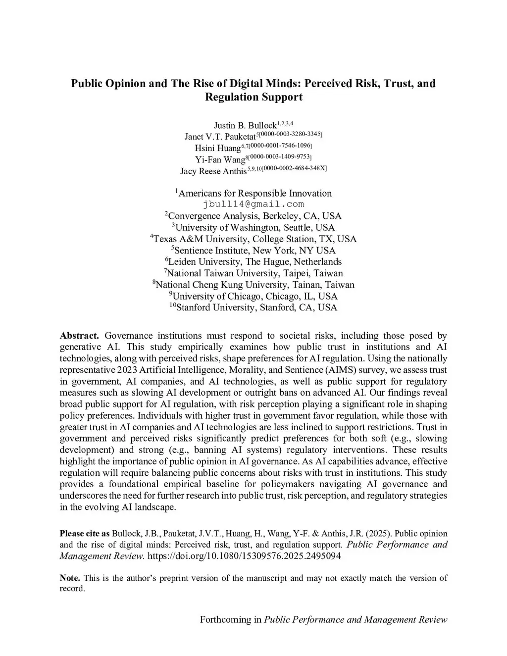 Public Opinion and The Rise of Digital Minds: Perceived Risk, Trust, and Regulation Support
