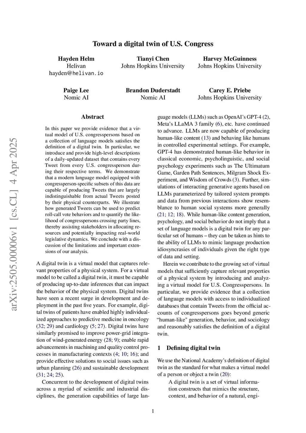 In this paper we provide evidence that a virtual model of U.S. congresspersons based on a collection of language models satisfies the definition of a digital twin. In particular, we introduce and provide high-level descriptions of a daily-updated dataset that contains every Tweet from every U.S. congressperson during their respective terms. We demonstrate that a modern language model equipped with congressperson-specific subsets of this data are capable of producing Tweets that are largely indistinguishable from actual Tweets posted by their physical counterparts. We illustrate how generated Tweets can be used to predict roll-call vote behaviors and to quantify the likelihood of congresspersons crossing party lines, thereby assisting stakeholders in allocating resources and potentially impacting real-world legislative dynamics. We conclude with a discussion of the limitations and important extensions of our analysis.