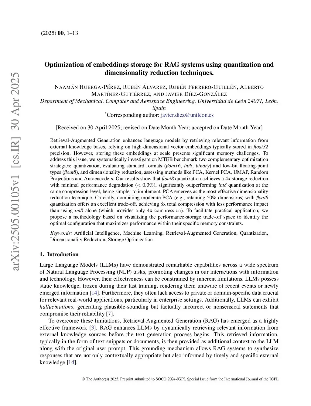 Optimization of embeddings storage for RAG systems using quantization and dimensionality reduction techniques