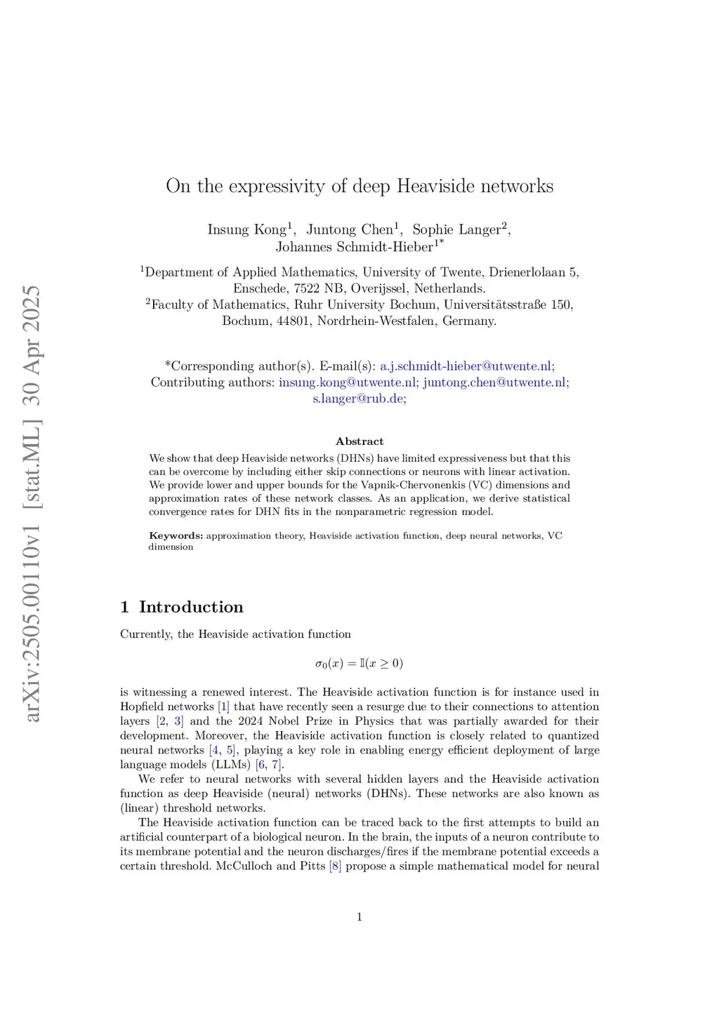 We show that deep Heaviside networks (DHNs) have limited expressiveness but that this can be overcome by including either skip connections or neurons with linear activation. We provide lower and upper bounds for the Vapnik-Chervonenkis (VC) dimensions and approximation rates of these network classes. As an application, we derive statistical convergence rates for DHN fits in the nonparametric regression model.