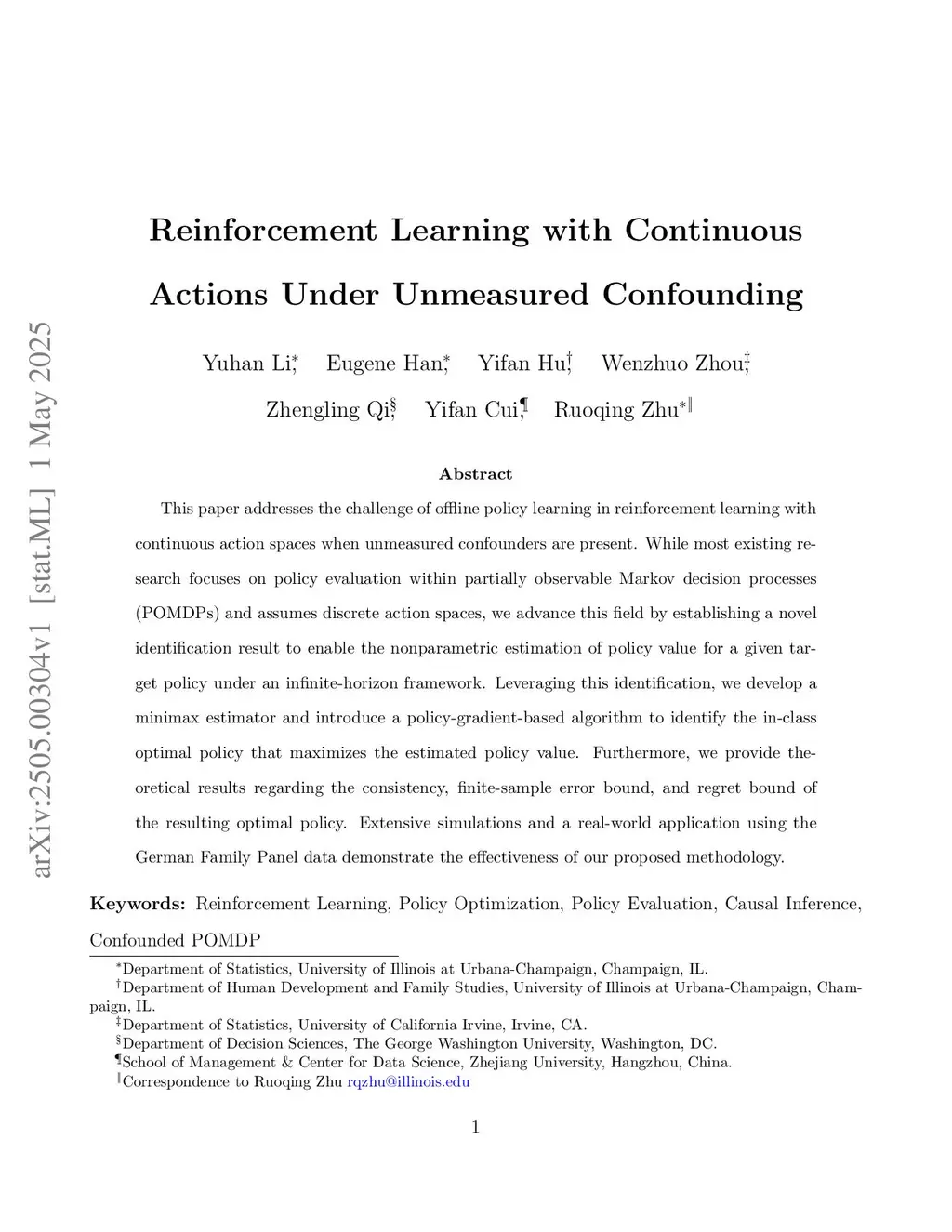 Reinforcement Learning with Continuous Actions Under Unmeasured Confounding