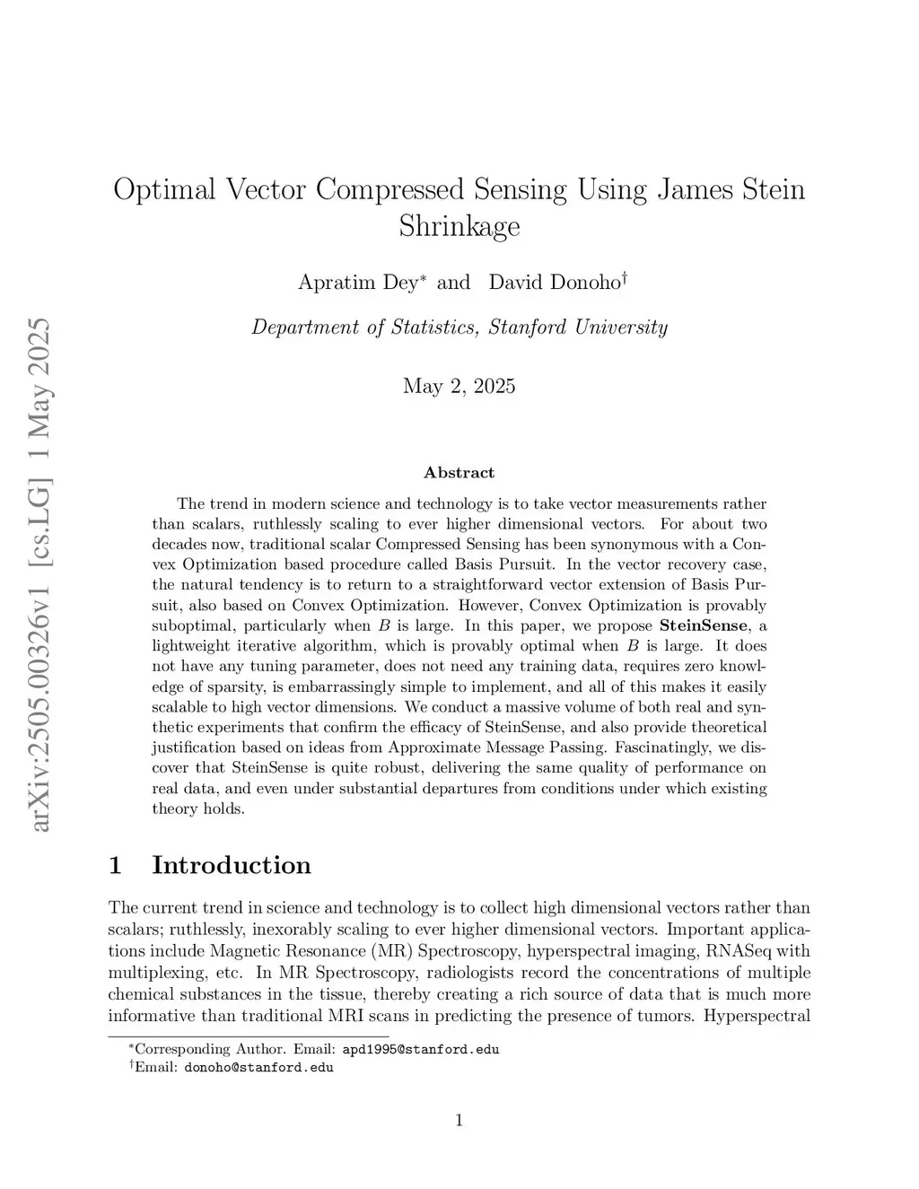 The trend in modern science and technology is to take vector measurements rather than scalars, ruthlessly scaling to ever higher dimensional vectors. For about two decades now, traditional scalar Compressed Sensing has been synonymous with a Convex Optimization based procedure called Basis Pursuit. In the vector recovery case, the natural tendency is to return to a straightforward vector extension of Basis Pursuit, also based on Convex Optimization. However, Convex Optimization is provably suboptimal, particularly when is large. In this paper, we propose SteinSense, a lightweight iterative algorithm, which is provably optimal when is large. It does not have any tuning parameter, does not need any training data, requires zero knowledge of sparsity, is embarrassingly simple to implement, and all of this makes it easily scalable to high vector dimensions. We conduct a massive volume of both real and synthetic experiments that confirm the efficacy of SteinSense, and also provide theoretical justification based on ideas from Approximate Message Passing. Fascinatingly, we discover that SteinSense is quite robust, delivering the same quality of performance on real data, and even under substantial departures from conditions under which existing theory holds.