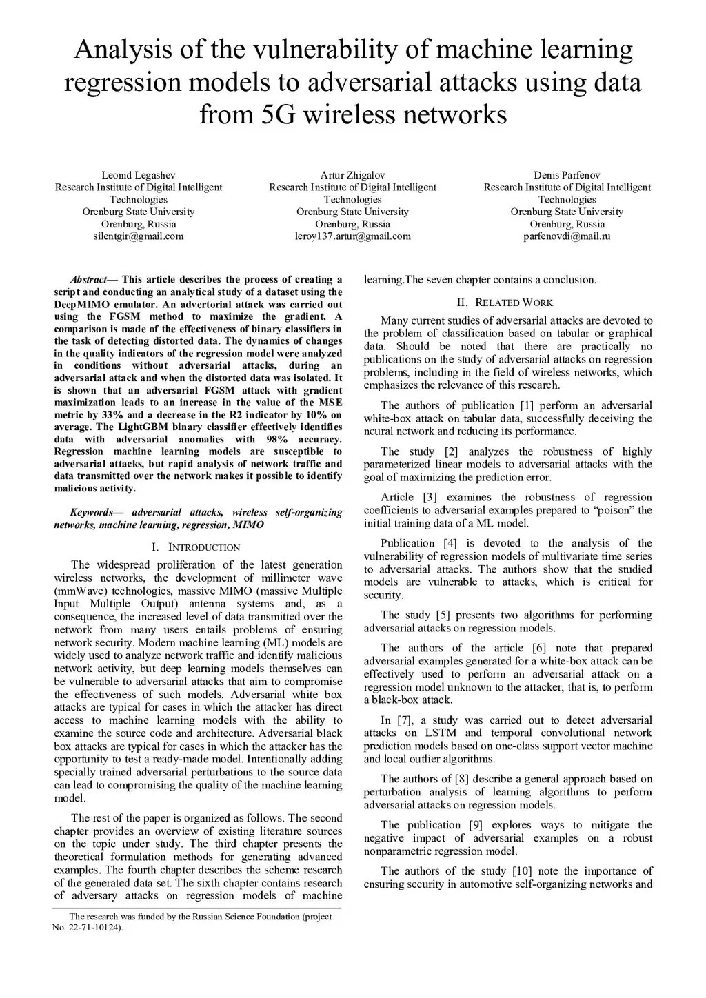 This article describes the process of creating a script and conducting an analytical study of a dataset using the DeepMIMO emulator. An advertorial attack was carried out using the FGSM method to maximize the gradient. A comparison is made of the effectiveness of binary classifiers in the task of detecting distorted data. The dynamics of changes in the quality indicators of the regression model were analyzed in conditions without adversarial attacks, during an adversarial attack and when the distorted data was isolated. It is shown that an adversarial FGSM attack with gradient maximization leads to an increase in the value of the MSE metric by 33% and a decrease in the R2 indicator by 10% on average. The LightGBM binary classifier effectively identifies data with adversarial anomalies with 98% accuracy. Regression machine learning models are susceptible to adversarial attacks, but rapid analysis of network traffic and data transmitted over the network makes it possible to identify malicious activity