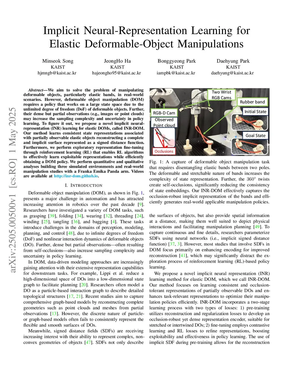 We aim to solve the problem of manipulating deformable objects, particularly elastic bands, in real-world scenarios. However, deformable object manipulation (DOM) requires a policy that works on a large state space due to the unlimited degree of freedom (DoF) of deformable objects. Further, their dense but partial observations (e.g., images or point clouds) may increase the sampling complexity and uncertainty in policy learning. To figure it out, we propose a novel implicit neural-representation (INR) learning for elastic DOMs, called INR-DOM. Our method learns consistent state representations associated with partially observable elastic objects reconstructing a complete and implicit surface represented as a signed distance function. Furthermore, we perform exploratory representation fine-tuning through reinforcement learning (RL) that enables RL algorithms to effectively learn exploitable representations while efficiently obtaining a DOM policy. We perform quantitative and qualitative analyses building three simulated environments and real-world manipulation studies with a Franka Emika Panda arm. Videos are available atthis http URL.