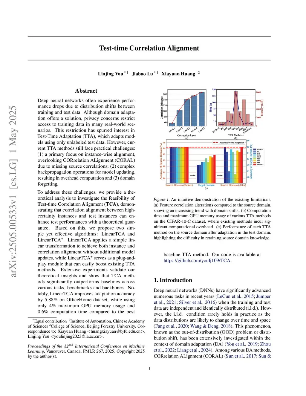 Deep neural networks often degrade under distribution shifts. Although domain adaptation offers a solution, privacy constraints often prevent access to source data, making Test-Time Adaptation (TTA, which adapts using only unlabeled test data) increasingly attractive. However, current TTA methods still face practical challenges: (1) a primary focus on instance-wise alignment, overlooking CORrelation ALignment (CORAL) due to missing source correlations; (2) complex backpropagation operations for model updating, resulting in overhead computation and (3) domain forgetting. To address these challenges, we provide a theoretical analysis to investigate the feasibility of Test-time Correlation Alignment (TCA), demonstrating that correlation alignment between high-certainty instances and test instances can enhance test performances with a theoretical guarantee. Based on this, we propose two simple yet effective algorithms: LinearTCA and LinearTCA+. LinearTCA applies a simple linear transformation to achieve both instance and correlation alignment without additional model updates, while LinearTCA+ serves as a plug-and-play module that can easily boost existing TTA methods. Extensive experiments validate our theoretical insights and show that TCA methods significantly outperforms baselines across various tasks, benchmarks and backbones. Notably, LinearTCA achieves higher accuracy with only 4% GPU memory and 0.6% computation time compared to the best TTA baseline. It also outperforms existing methods on CLIP over 1.86%.