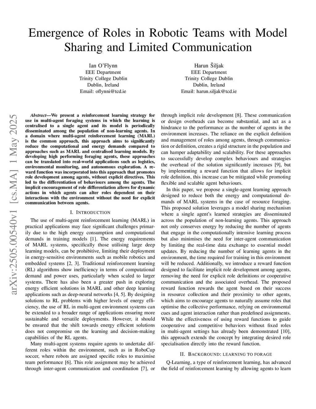 We present a reinforcement learning strategy for use in multi-agent foraging systems in which the learning is centralised to a single agent and its model is periodically disseminated among the population of non-learning agents. In a domain where multi-agent reinforcement learning (MARL) is the common approach, this approach aims to significantly reduce the computational and energy demands compared to approaches such as MARL and centralised learning models. By developing high performing foraging agents, these approaches can be translated into real-world applications such as logistics, environmental monitoring, and autonomous exploration. A reward function was incorporated into this approach that promotes role development among agents, without explicit directives. This led to the differentiation of behaviours among the agents. The implicit encouragement of role differentiation allows for dynamic actions in which agents can alter roles dependent on their interactions with the environment without the need for explicit communication between agents.