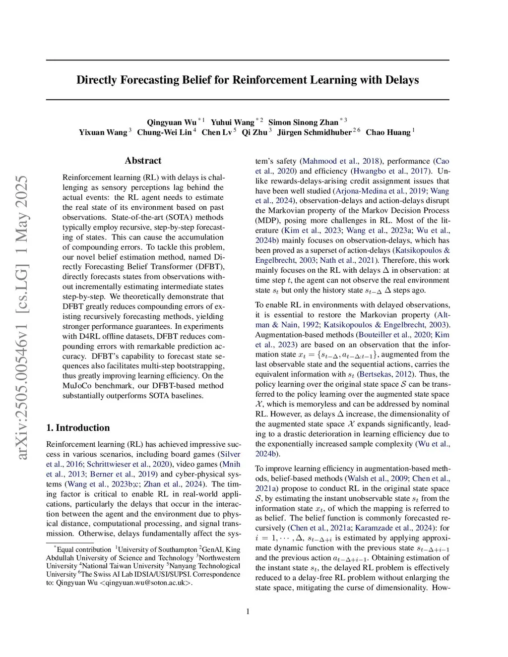 Reinforcement learning (RL) with delays is challenging as sensory perceptions lag behind the actual events: the RL agent needs to estimate the real state of its environment based on past observations. State-of-the-art (SOTA) methods typically employ recursive, step-by-step forecasting of states. This can cause the accumulation of compounding errors. To tackle this problem, our novel belief estimation method, named Directly Forecasting Belief Transformer (DFBT), directly forecasts states from observations without incrementally estimating intermediate states step-by-step. We theoretically demonstrate that DFBT greatly reduces compounding errors of existing recursively forecasting methods, yielding stronger performance guarantees. In experiments with D4RL offline datasets, DFBT reduces compounding errors with remarkable prediction accuracy. DFBT's capability to forecast state sequences also facilitates multi-step bootstrapping, thus greatly improving learning efficiency. On the MuJoCo benchmark, our DFBT-based method substantially outperforms SOTA baselines. Code is available atthis https URL.