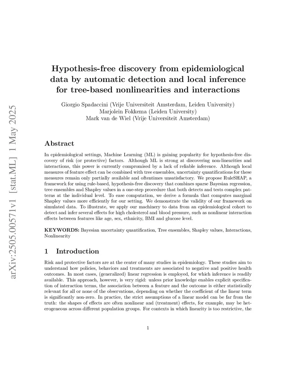 Machine Learning (ML) is gaining popularity for hypothesis-free discovery of risk and protective factors in healthcare studies. ML is strong at discovering nonlinearities and interactions, but this power is compromised by a lack of reliable inference. Although Shapley values provide local measures of features' effects, valid uncertainty quantification for these effects is typically lacking, thus precluding statistical inference. We propose RuleSHAP, a framework that addresses this limitation by combining a dedicated Bayesian sparse regression model with a new tree-based rule generator and Shapley value attribution. RuleSHAP provides detection of nonlinear and interaction effects with uncertainty quantification at the individual level. We derive an efficient formula for computing marginal Shapley values within this framework. We demonstrate the validity of our framework on simulated data. Finally, we apply RuleSHAP to data from an epidemiological cohort to detect and infer several effects for high cholesterol and blood pressure, such as nonlinear interaction effects between features like age, sex, ethnicity, BMI and glucose level.