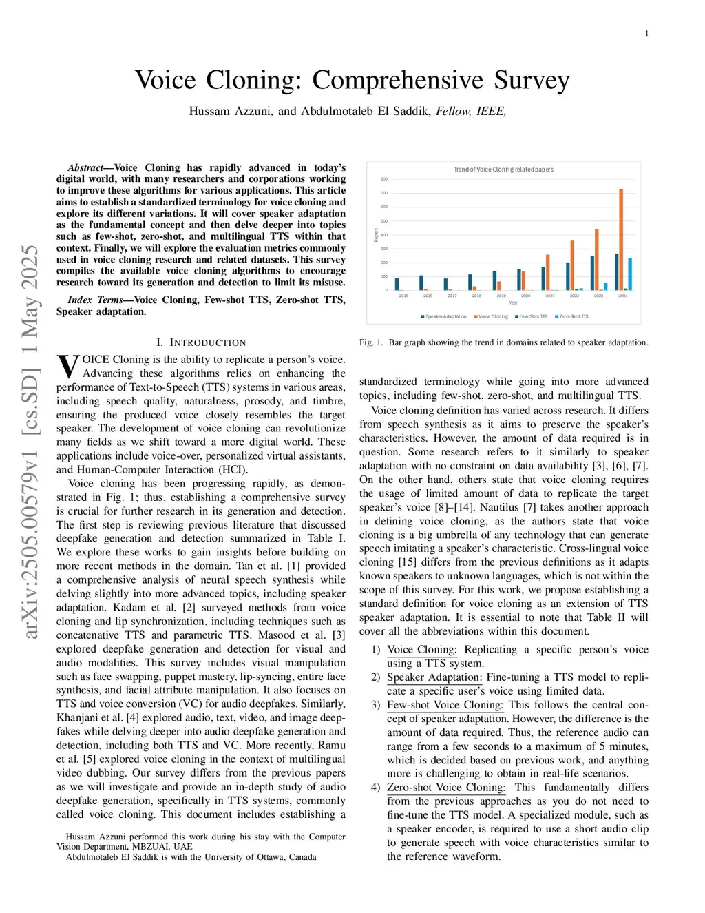 Voice Cloning has rapidly advanced in today's digital world, with many researchers and corporations working to improve these algorithms for various applications. This article aims to establish a standardized terminology for voice cloning and explore its different variations. It will cover speaker adaptation as the fundamental concept and then delve deeper into topics such as few-shot, zero-shot, and multilingual TTS within that context. Finally, we will explore the evaluation metrics commonly used in voice cloning research and related datasets. This survey compiles the available voice cloning algorithms to encourage research toward its generation and detection to limit its misuse.