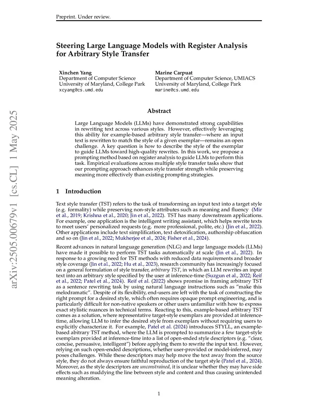 Large Language Models (LLMs) have demonstrated strong capabilities in rewriting text across various styles. However, effectively leveraging this ability for example-based arbitrary style transfer, where an input text is rewritten to match the style of a given exemplar, remains an open challenge. A key question is how to describe the style of the exemplar to guide LLMs toward high-quality rewrites. In this work, we propose a prompting method based on register analysis to guide LLMs to perform this task. Empirical evaluations across multiple style transfer tasks show that our prompting approach enhances style transfer strength while preserving meaning more effectively than existing prompting strategies.