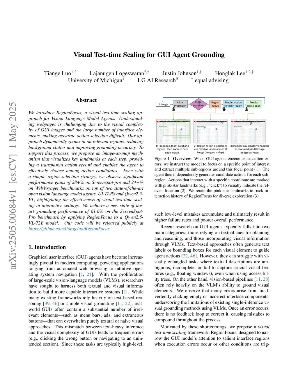 We introduce RegionFocus, a visual test-time scaling approach for Vision Language Model Agents. Understanding webpages is challenging due to the visual complexity of GUI images and the large number of interface elements, making accurate action selection difficult. Our approach dynamically zooms in on relevant regions, reducing background clutter and improving grounding accuracy. To support this process, we propose an image-as-map mechanism that visualizes key landmarks at each step, providing a transparent action record and enables the agent to effectively choose among action candidates. Even with a simple region selection strategy, we observe significant performance gains of 28+\% on Screenspot-pro and 24+\% on WebVoyager benchmarks on top of two state-of-the-art open vision language model agents, UI-TARS and Qwen2.5-VL, highlighting the effectiveness of visual test-time scaling in interactive settings. We achieve a new state-of-the-art grounding performance of 61.6\% on the ScreenSpot-Pro benchmark by applying RegionFocus to a Qwen2.5-VL-72B model. Our code will be released publicly atthis https URL.